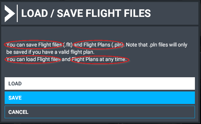 - Restore save / load function (both .flt and if a flight plan used with .pln) and also allowing the saving and loading after fly now.