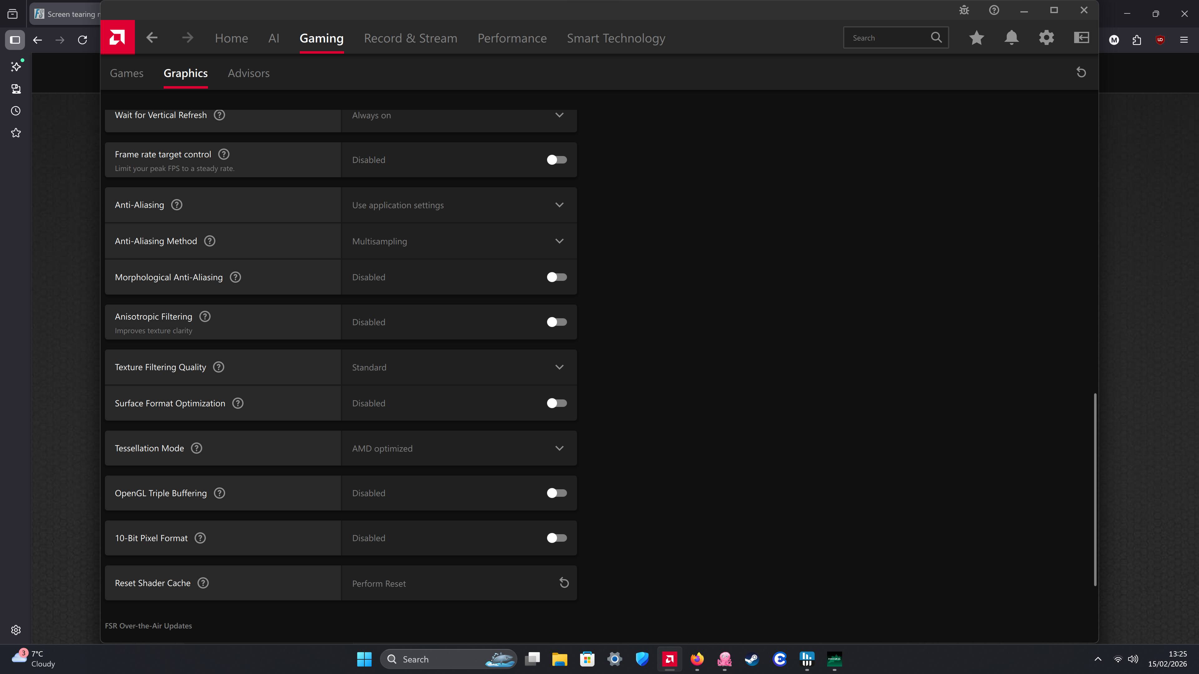 Hi, I have had no tearing on my 9070XT until the feb 2026 Adrenaline driver. No other settings changed. And now - even when downgrading to the previous driver version - I still have tearing. Run 60Hz on my monitor and 30 FPS with 2x framegen as I always have had. No issues until now, and I have tried all settings but still no luck.