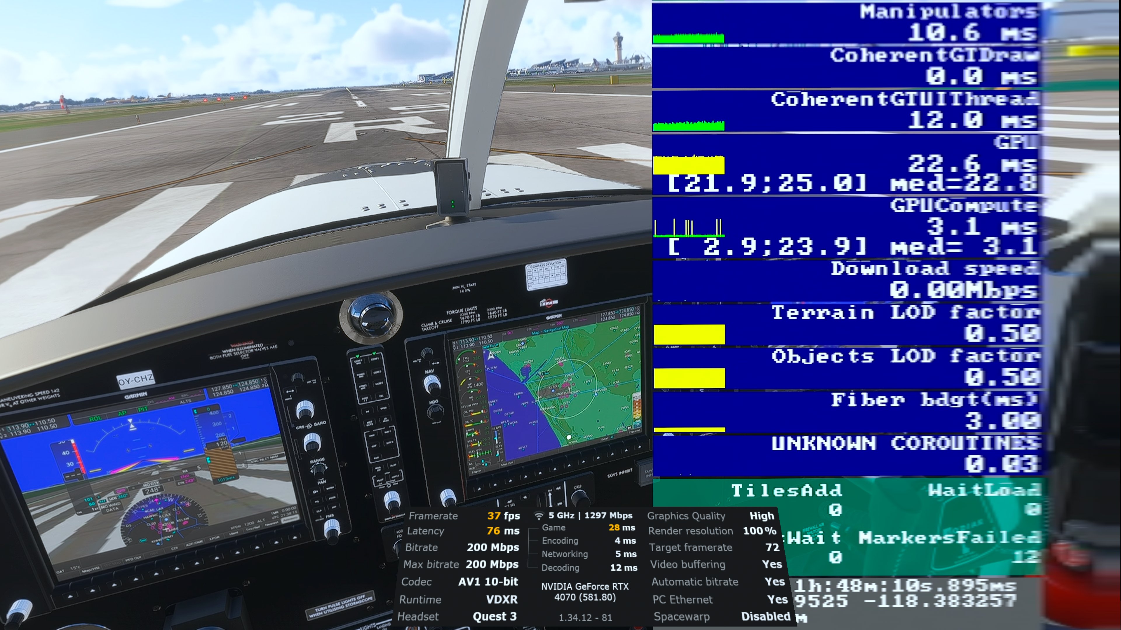 This is the same ODT that I use for both Link and Air Link with both my Q3 and QPro headsets. Using the ODT Performance/Link Details HUD this normally results in 750-800mbps bitrate with Link and 220-230mbps with Air Link. Both actually give very good results with msfs2020/2024. Link results in a bit fewer compression artifacts (like = none) and slightly better distance clarity. Cockpit clarity, thanks to the latest dlss override with preset K, is good (= TAA clarity) using dlss/balanced, and I’ve found I no longer need to increase ODT Pixel density to improve these.
