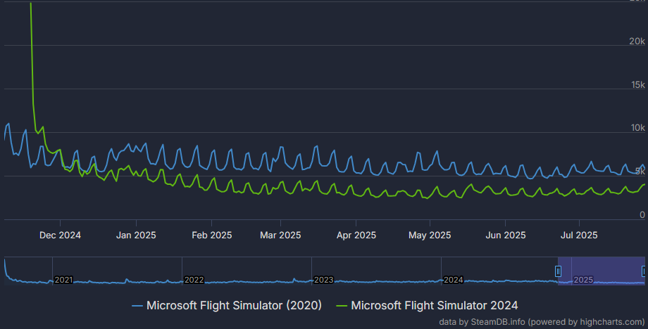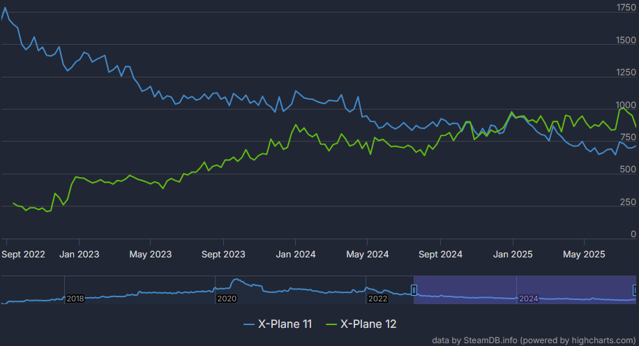 You see the migration to the new platform straight away, but here that adoption process has continued, instead of levelling off. I think in the MSFS case its bolstered by users of both platforms. Something else that may explain the XP status is, although I haven’t been following too closely, they tend to release updates that are less problematic than MSFS ones, and they don’t have situations like the 2024 release which put people off within a few days of release.