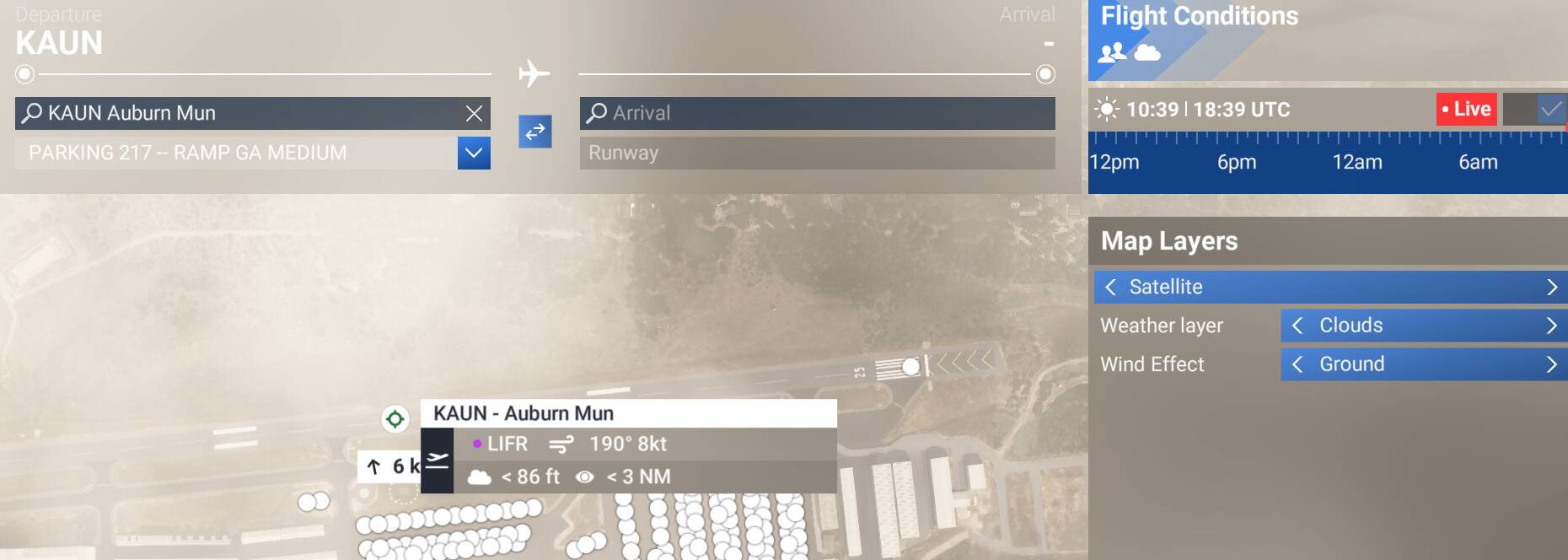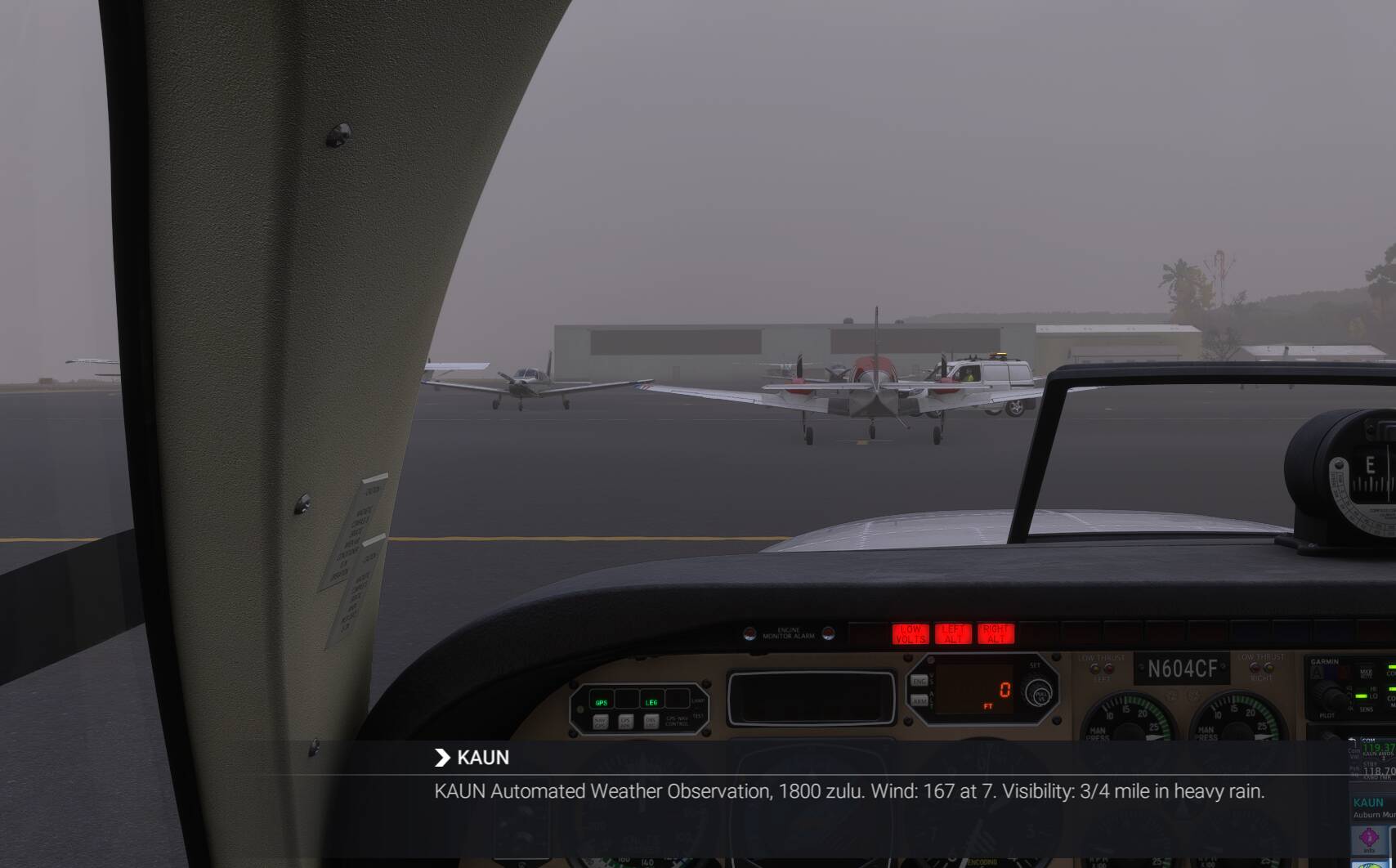 Now, what’s interesting in the sim is that it nearly matches the METAR, except that the sim is reporting heavy rain. KAUN’s AWOS doesn’t have a precipitation discriminator (A01), so where is it getting that? I wonder if there is another METAR locally that is overriding or the entire frontal system that is currently clearing AUN is responsible. There’s a lot of rain on the radar (just to the east now).