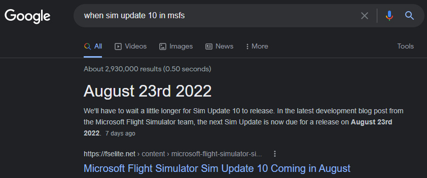 7 days ago, the flight sim community named FS-Elite said that the confirmed release date of Sim Update 10 is August 23rd, 2022. Which took us almost 2 months left. Does anyone have expectations?
