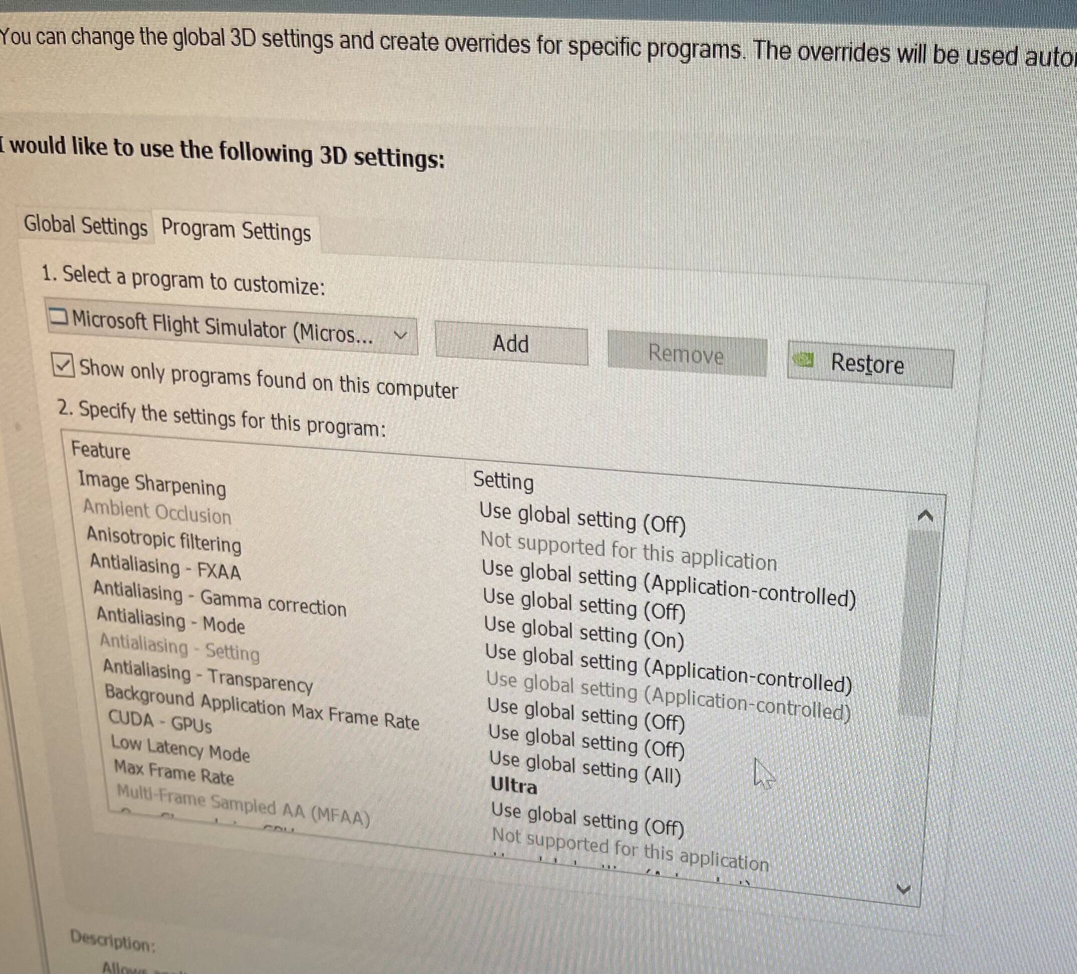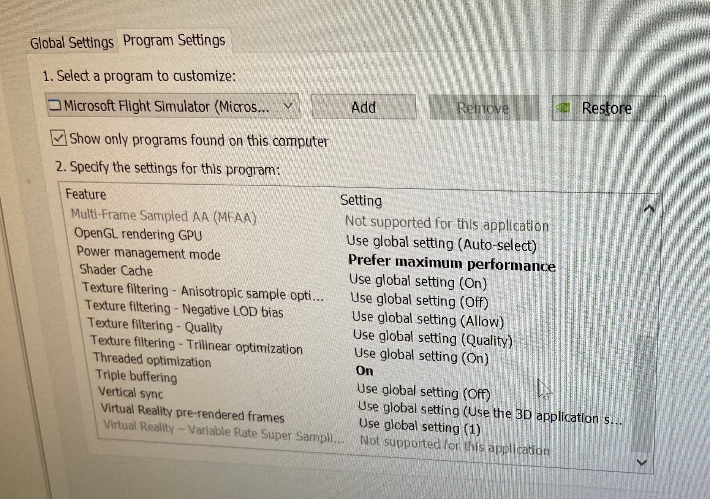 This morning I turned on my PC from shutdown state and sure enough the sim is a lot smoother. My approach at KLAX from KMIA with mod 787 was much smoother, still microstutters since you know it’s LA but flyable like it was prior to the sim update. So make sure your settings in the nvidia control panel are adjusted accordingly.
