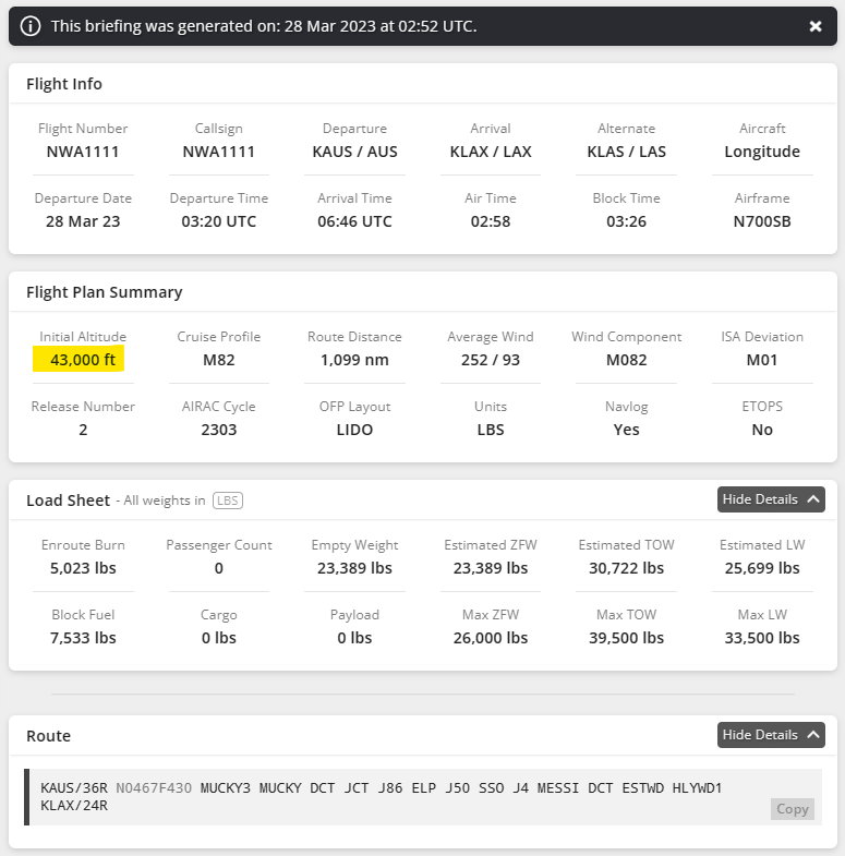Here’s what I got Austin to Los Angeles… Am I doing something wrong? I used to get even flight levels but not anymore. Does it have something to do with the M82 cruise profile?