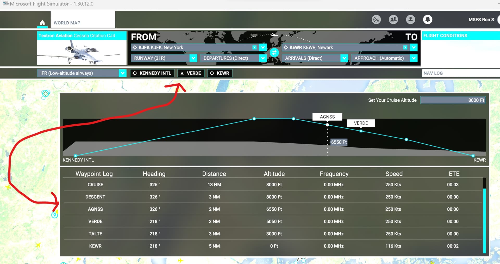 The flight Plan is automatically loaded into the CJ4 and ready to fly via the Auto Pilot.