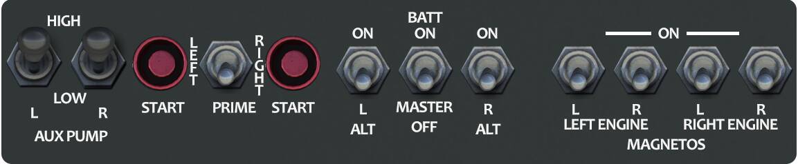 Milviz Cessna 310R Main electrical and engine switch panel.