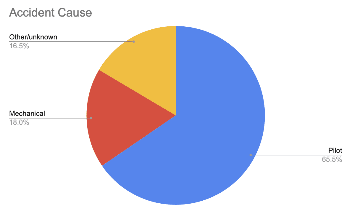 āAnd what can go wrong mostly means the engine. Airplane engines may be a lot more reliable than they were 75 years ago, but they are still the number one cause of mechanical accidentsāover 60% in 2018. To put that in perspective, a powerplant problem is behind only loss of control on landing on the list of top accident causes (see chart below). Remember, this excludes fuel management problems, so weāre talking about true power loss, either partial or complete. This happened 117 times in 2018, accounting for roughly 10% of all non-commercial fixed-wing accidents.ā