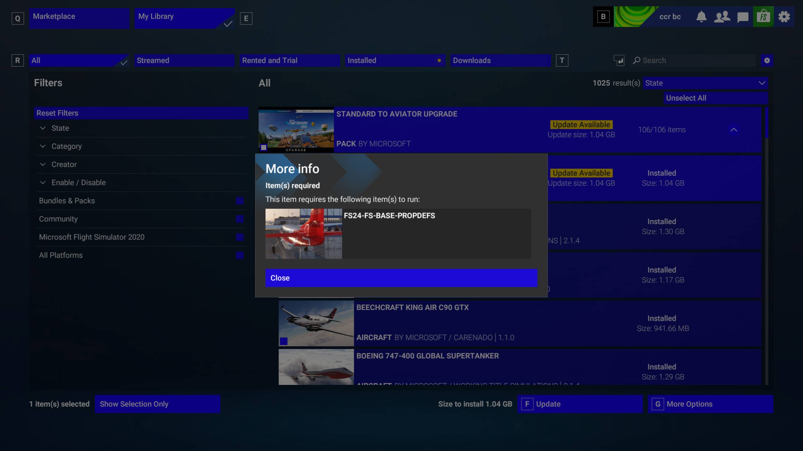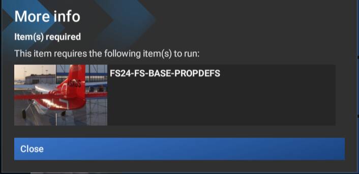 Note that when I click the More Options button next to Install, and then the More Info button, another small window says “This item requires the following item(s) to run: FS24-FS-BASE-PROPDEFS. So I don’t know if that’s the problem, and is somehow missing, or what that message means.