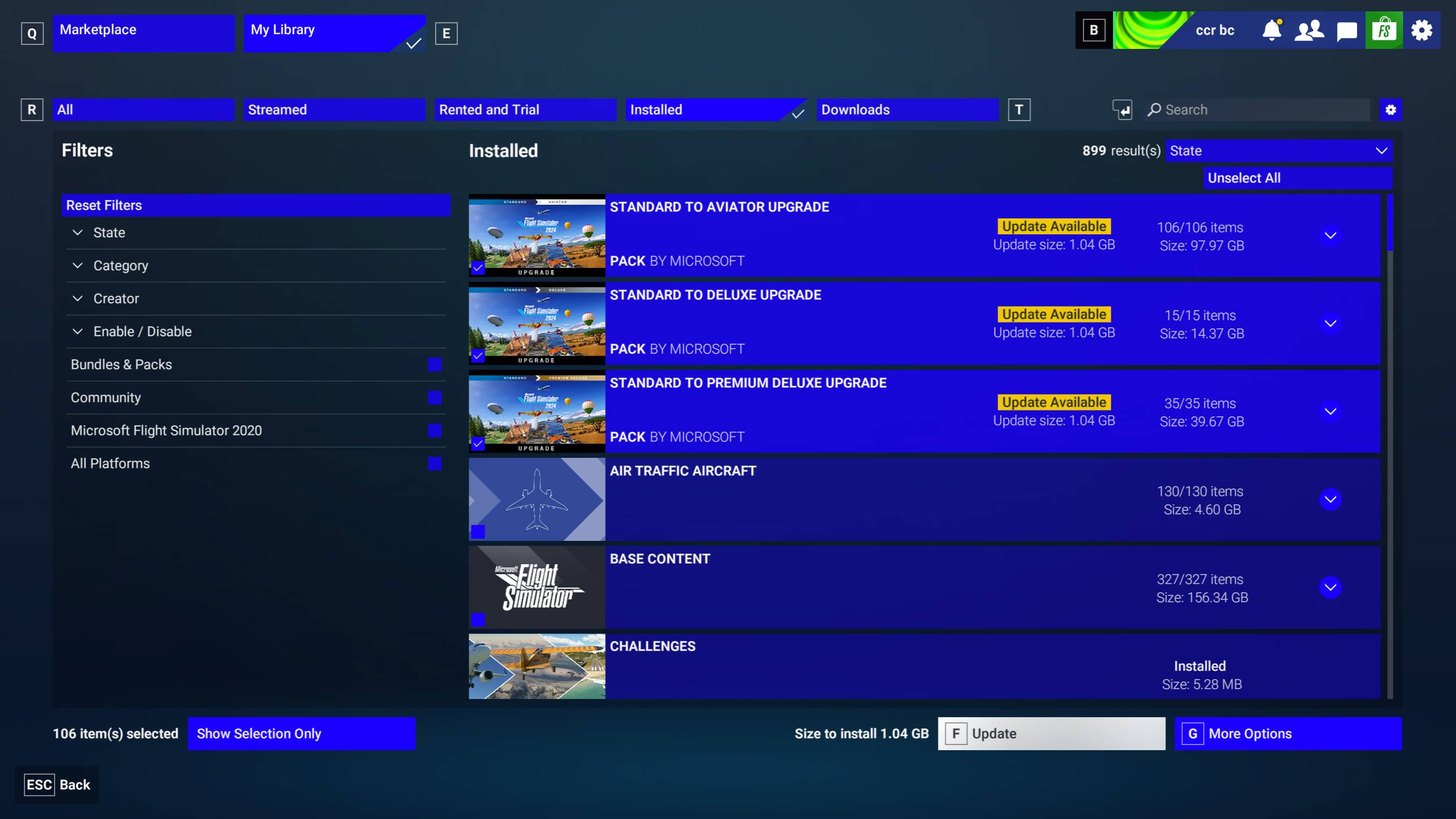 Next time I start the sim, it does the same thing…notifies me an update is ready to install, directs me to Marketplace, the 152 Aerobat file is the only thing showing ready to install (listed in both the Standard to Deluxe and Standard to Premium Deluxe packages), but when I select it and click Install, nothing happens.