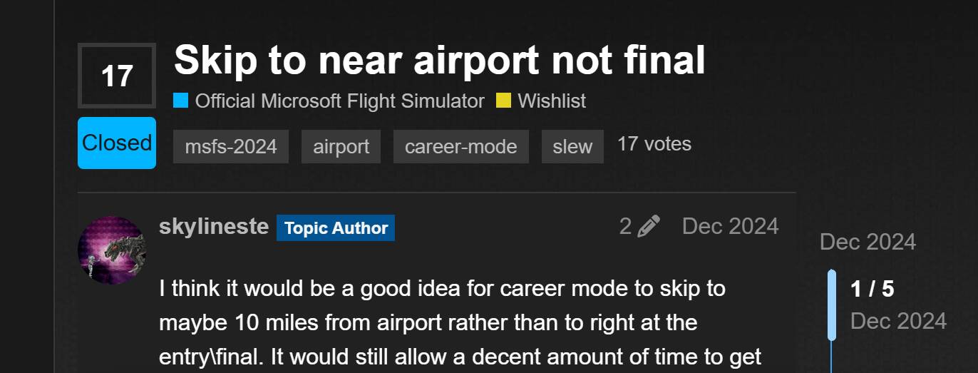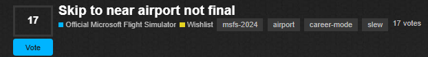 I think it would be a good idea for career mode to skip to maybe 10 miles from airport rather than to right at the entry\final. It would still allow a decent amount of time to get setup or change if required.