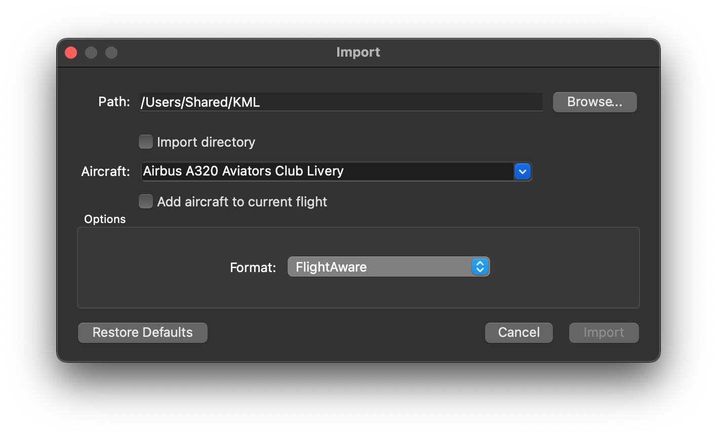 However KML is still a very popular format among flight tracker services such as the aforementioned flightaware.com and flightradar24.com. Here is how to import those KML files into Sky Dolly: