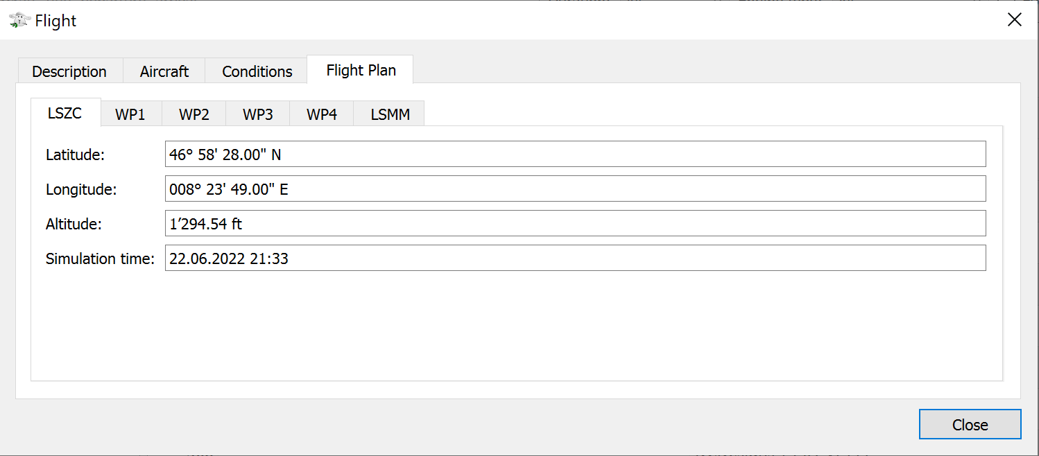 The Waypoints can be left as Route (<rte>): the flight plan will of course also be imported into Sky Dolly, as can then be seen in the Flight (key F) dialog, in the Flight Plan tab: