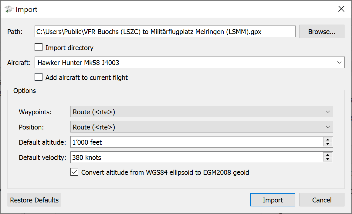 Typically GPX waypoints do not contain timestamp information (but as is the case with Little Navmap they may contain altitude data). This is where the default altitude and velocity options come into play: Sky Dolly uses this information to calculate the required time it takes to fly from one track point to the next, given their geodesic distance, and places the aircraft at a constant altitude (if needed).