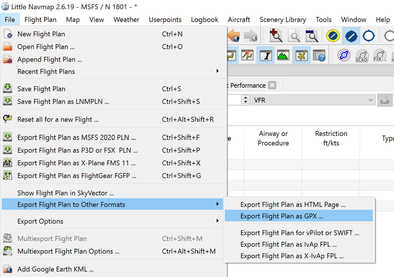 Flight plans generated in Little Navmap can be exported in the GPX format. So if we have a flight plan such as: