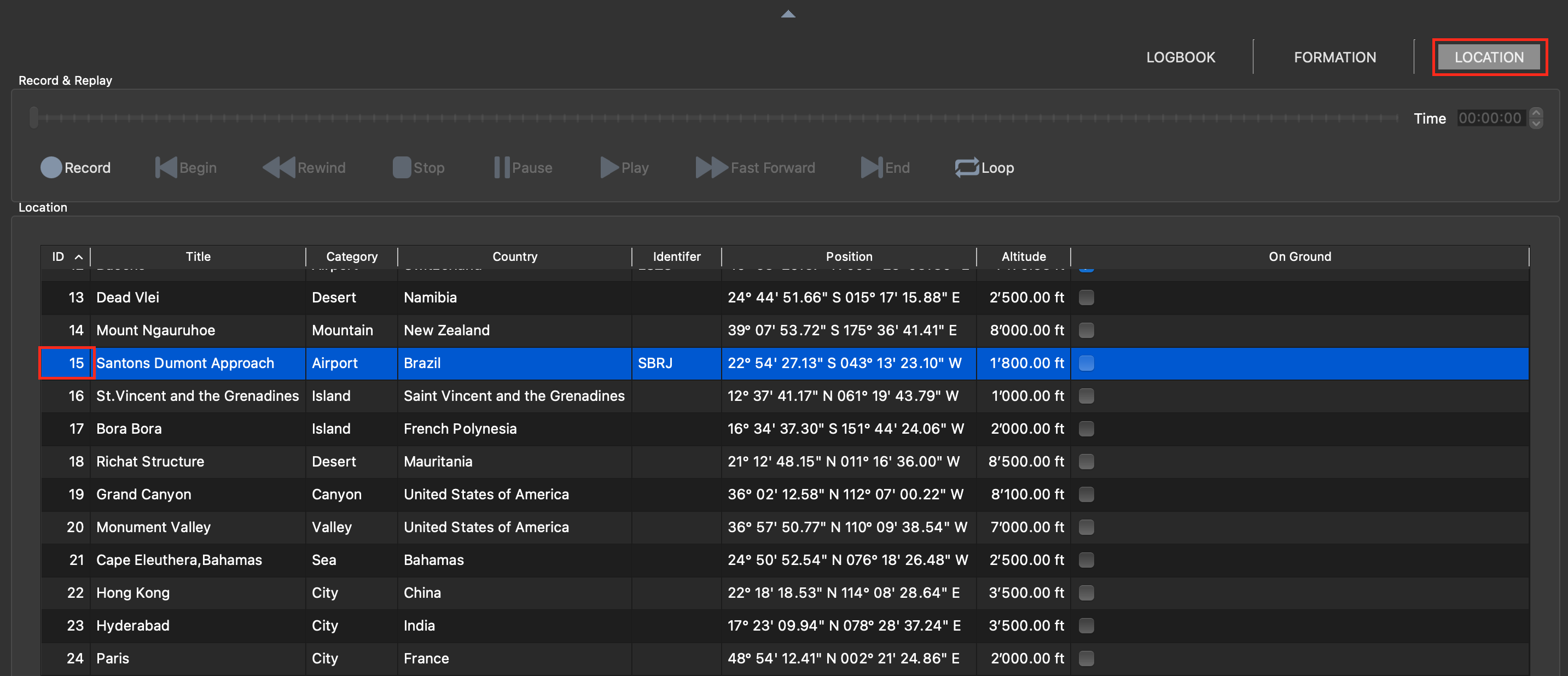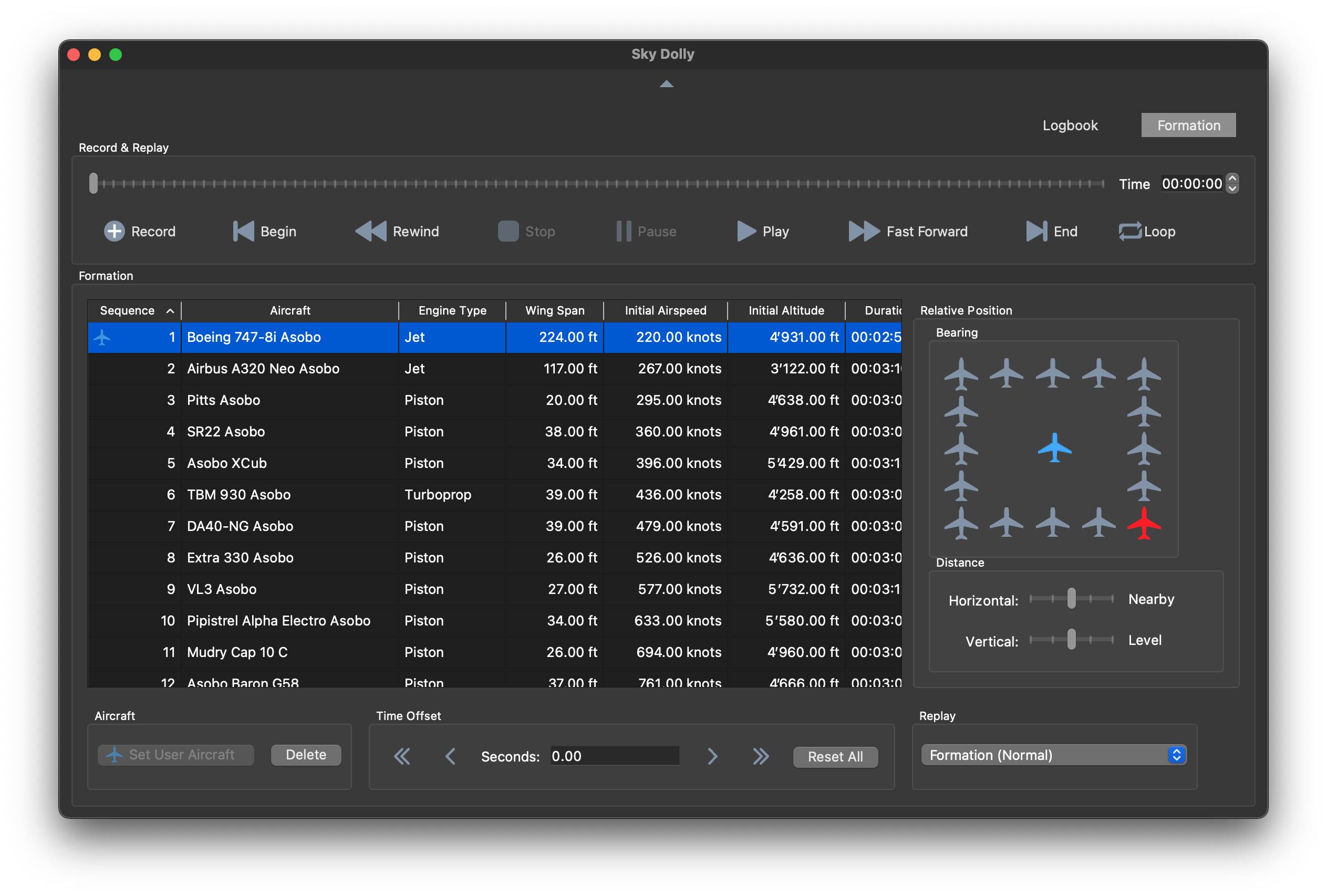 The formation module also lets you choose the initial position, relative to the current user aircraft in the formation. Each aircraft can be assigned a time offset: this is useful in case the aircraft were recorded on different computers (“multiplayer formation flight”) and each pilot pushed the Record button at a slightly different time.