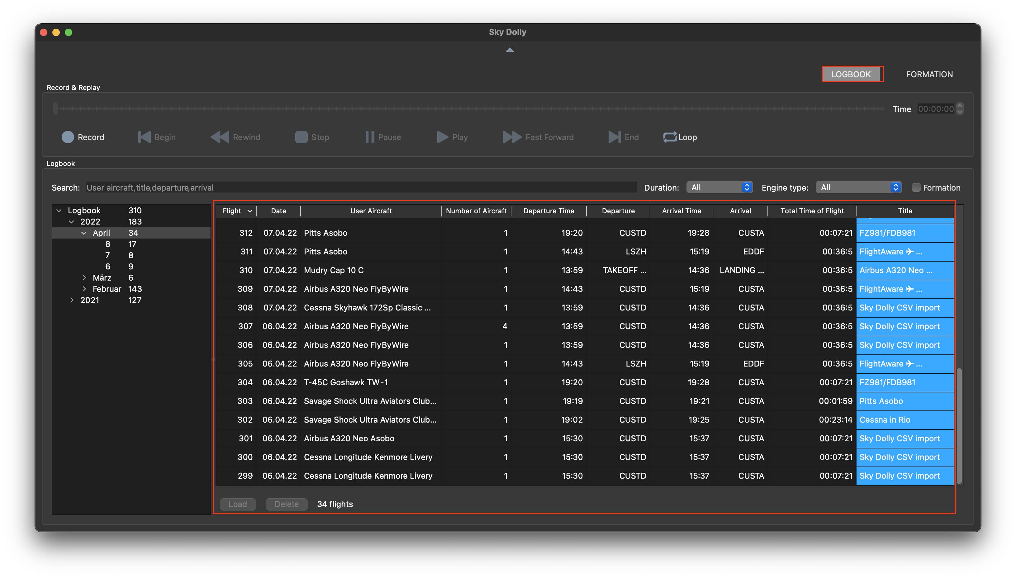 That’s it! Sky Dolly takes care that all your recorded aircraft get properly persisted in the logbook and that they are associated with the same flight.