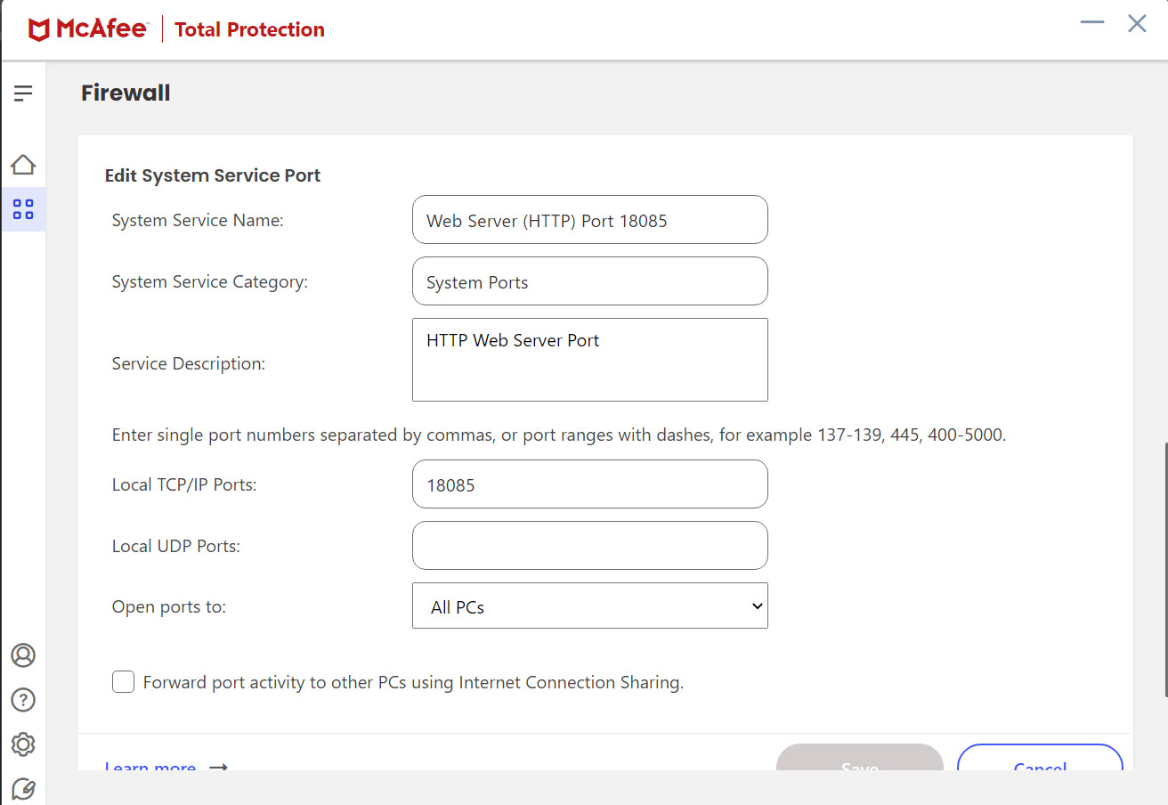 Please also note that you have to open your http port 18085 on your FS PC’s firewall too to allow ‘all PC’s’ access (see third image for how this is done in McAfee firewall)