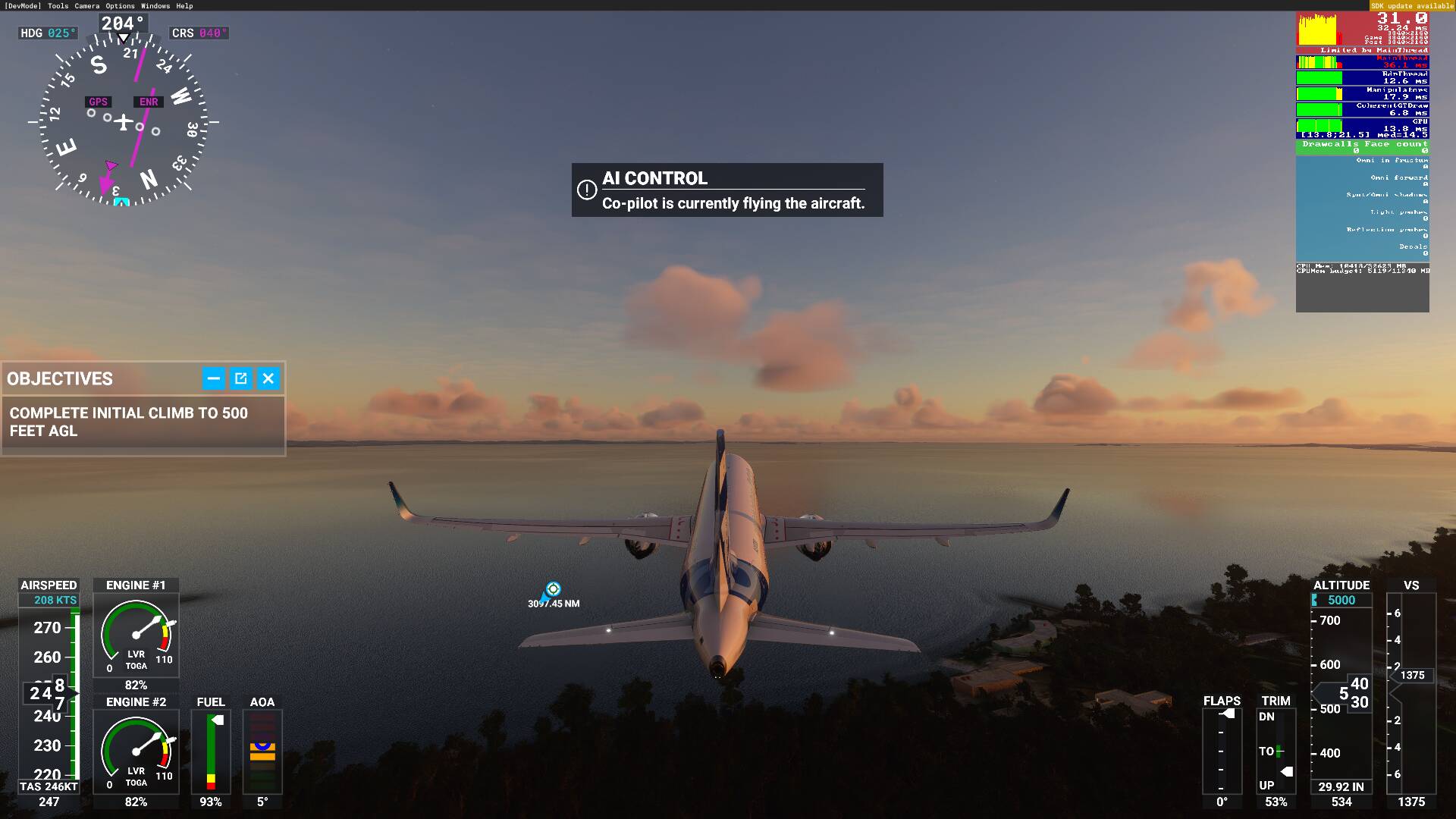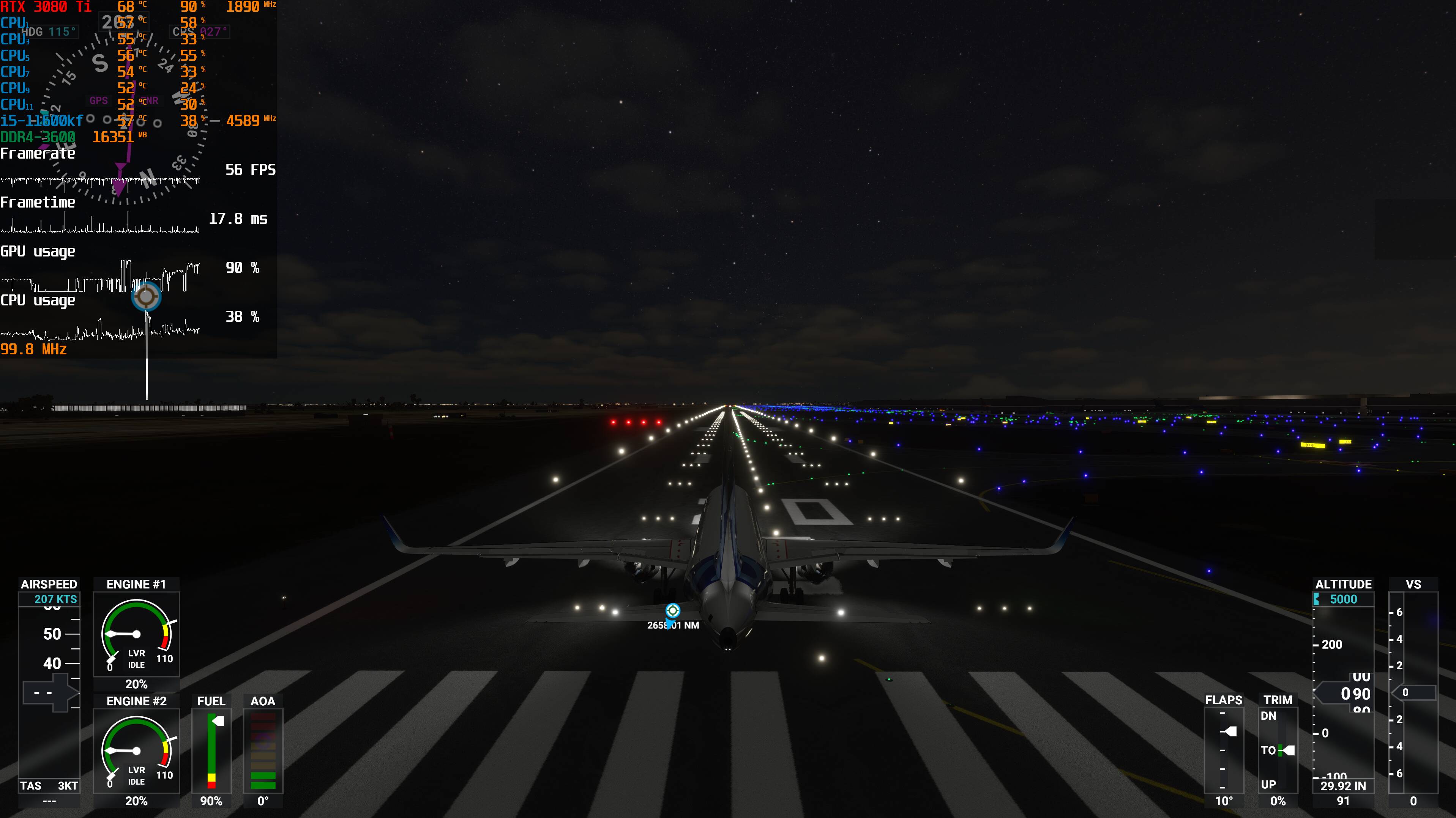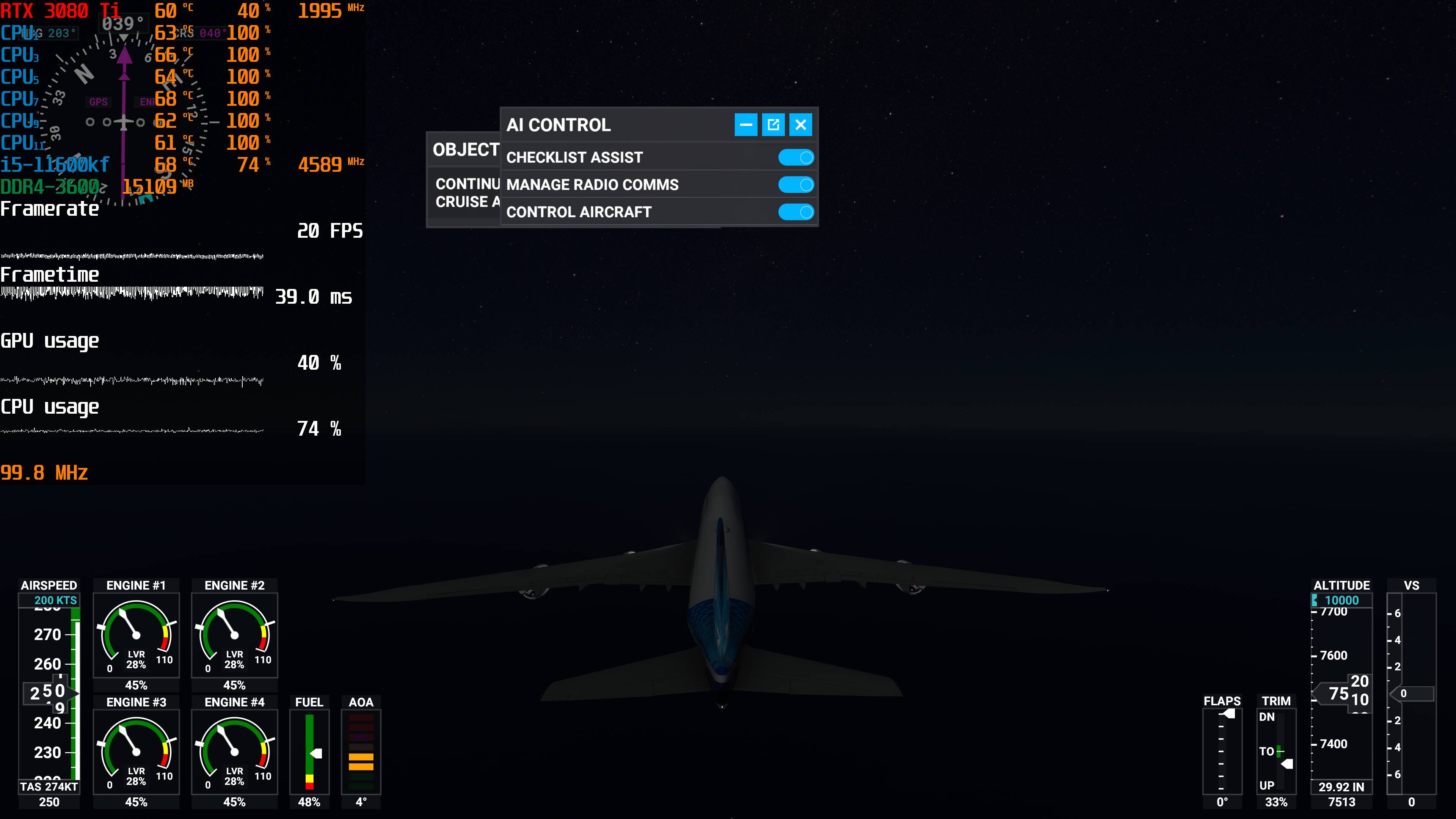 Yes, it sounds weird, I know. But 10% is the average. The 3080 sometimes peaks to 19% when flying low over New York - I get the lowest FPS there at about 42 FPS. My CPU is also maxes about 24% with 19% average and only gets to 64% when the sim is loading - and that doesn’t really count, for simming purposes. I rarely hear the fans of my cooler or the case fans and never hear the 3080 fans - the temps are middling low. I use the SDK monitor as well as NZXT mini monitor. They both say the same thing. I am sure the numbers are due to my settings selections, although many are Ultra. It is also true that I mostly always shut off clouds and fly in Clear Skies and all the AI traffic off, as I said. I am in the mode of learning how to really fly and I want to see the World as well. I never use airliners or larger GA planes. I stick to things like the JMB mods (Vertigo, Rotax, Stock), the Spit, the MB-399 and the H135 chopper - and fly at 1k ft as much as possible. The numbers are what they are and I am very happy - aside from the pauses.