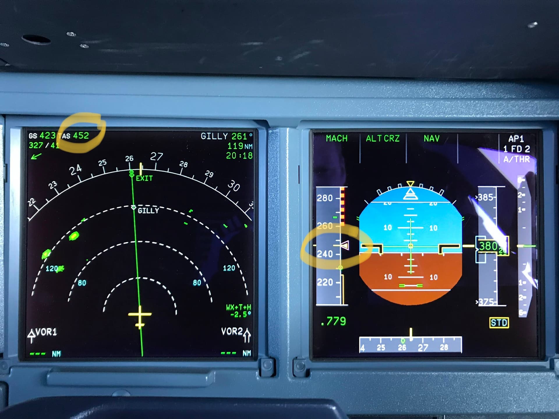 Just an example of what I’m talking about. 245 knots indicated on the PFD (right side) is giving a true airspeed of 452 knots at 38000 feet. If you descend to 25000 feet you can fly at 350 knots indicated and achieve a true airspeed of about 520 knots. If you go lower than 25000 feet the true airspeed goes down, so 25000 feet is around where you get the highest true airspeed.