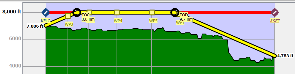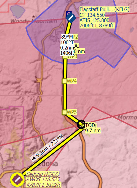 At least two things make the tutorial #8 flight interesting and challenging. First, there’s a two-thousand foot drop between Flagstaff and Sedona and since the flight is at least 1K above the ground, the overall descent is closer to 3,000 feet, most of it in the last few nautical miles. To add to the challenge, the flight is scheduled only a half an hour or so before sunset and as a 24 minute flight or so, there is no time for missed approaches, etc.