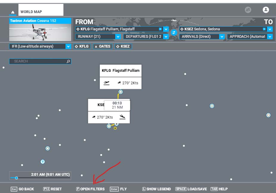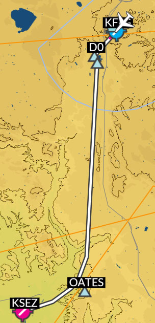 Now to practice, use the flight plan to fly. Click the FLY button in the World Map. Then READY TO FLY. If you open the VFR map, the IFR flight plan you created just to practice your approach might look something like this with Oates picked as a waypoint near Munds Park.