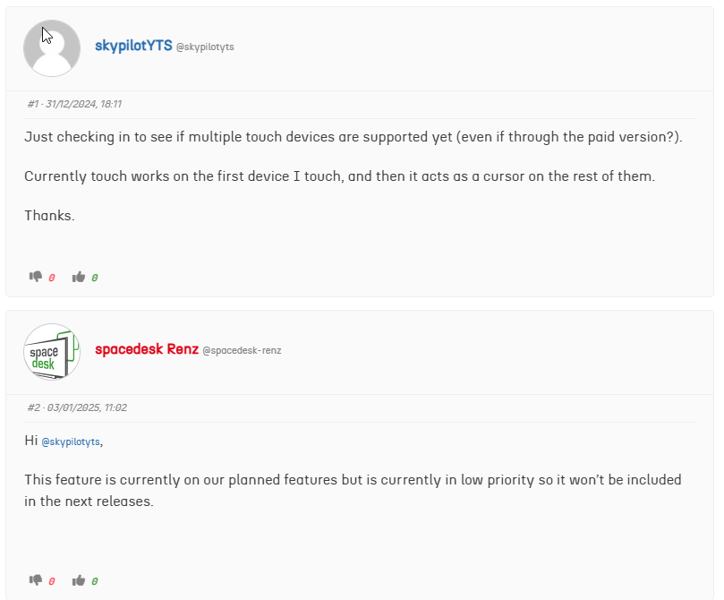 Sure, it “works” on multiple devices now, but the first SpaceDesk screen you touch gets the true touch support, the next ones just act as mouse / cursor.
