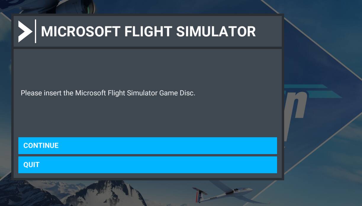 Today I am greeted with „Please insert the Microsoft Flight Simulator Game Disc“. That is a new one for me. I had the „Cannot authenticate“ message a few times before. Every time it seems there is something broken in the underlying services and the messages are not really useful, perhaps even misleading.