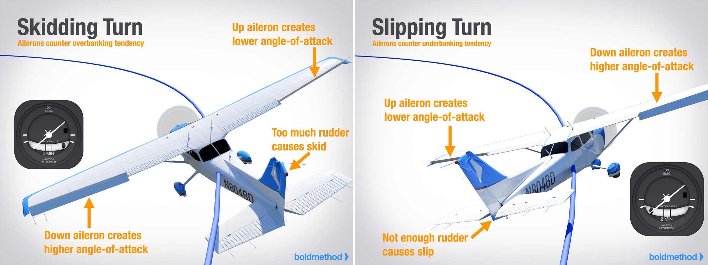 The topic that I have created is the Adverse Yaw Effect. Which is the initial tendency of the aircraft which slips to the right when you make a left turn (without using the rudder at all). In this condition the ball in the turn coordinator will go to the left side indicating the pilot to use the left rudder! At this point, pilot should apply left rudder to coordinate his flight. If he applies more rudder the aircraft goes to skid!