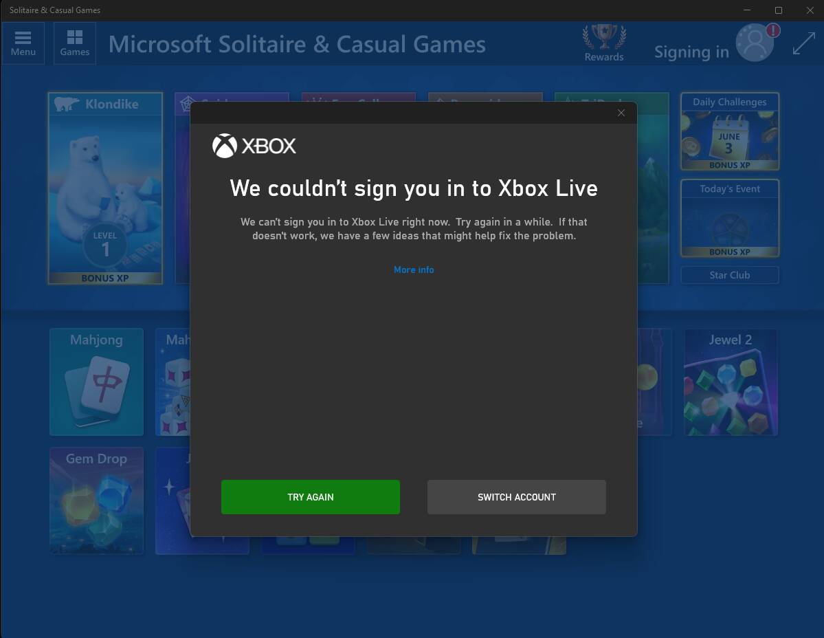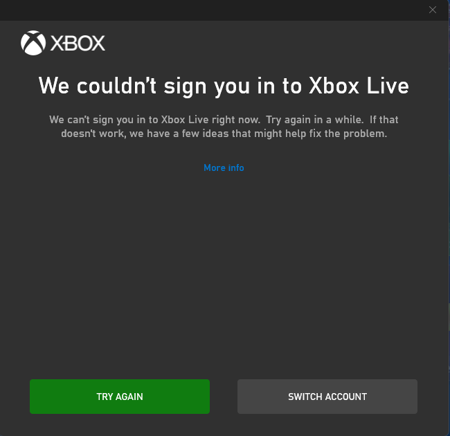The most messed up thing is that I’m using the same account for my Windows login and it works fine. Same account for MS Store and it works fine. I can ALWAYS login into the Xbox app with the same account without a problem. But when I start a game it refuses to login.