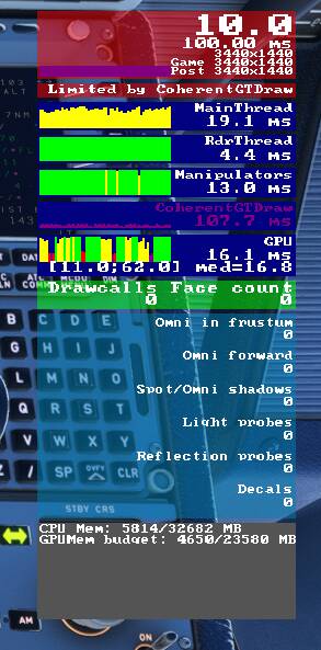 I do not understand this. 10 FPS. 100 ms to build and send each frame. CoherentGTDraw takes 107.7 ms to build a frame which is about 9.2 FPS. I can see that ālimited by CoherentGTDrawā makes sense. But how can a frame be delivered at 100ms if CoherentGTDraw builds a frame in 107.7 ms? Is the FPS counter using an average? Or is the 100 ms time for the current frame and 107.7 the time for the next frame? Iām not familiar with CoherentGTDraw so maybe there are other things squeezing the 107.7 ms down to 100 ms.