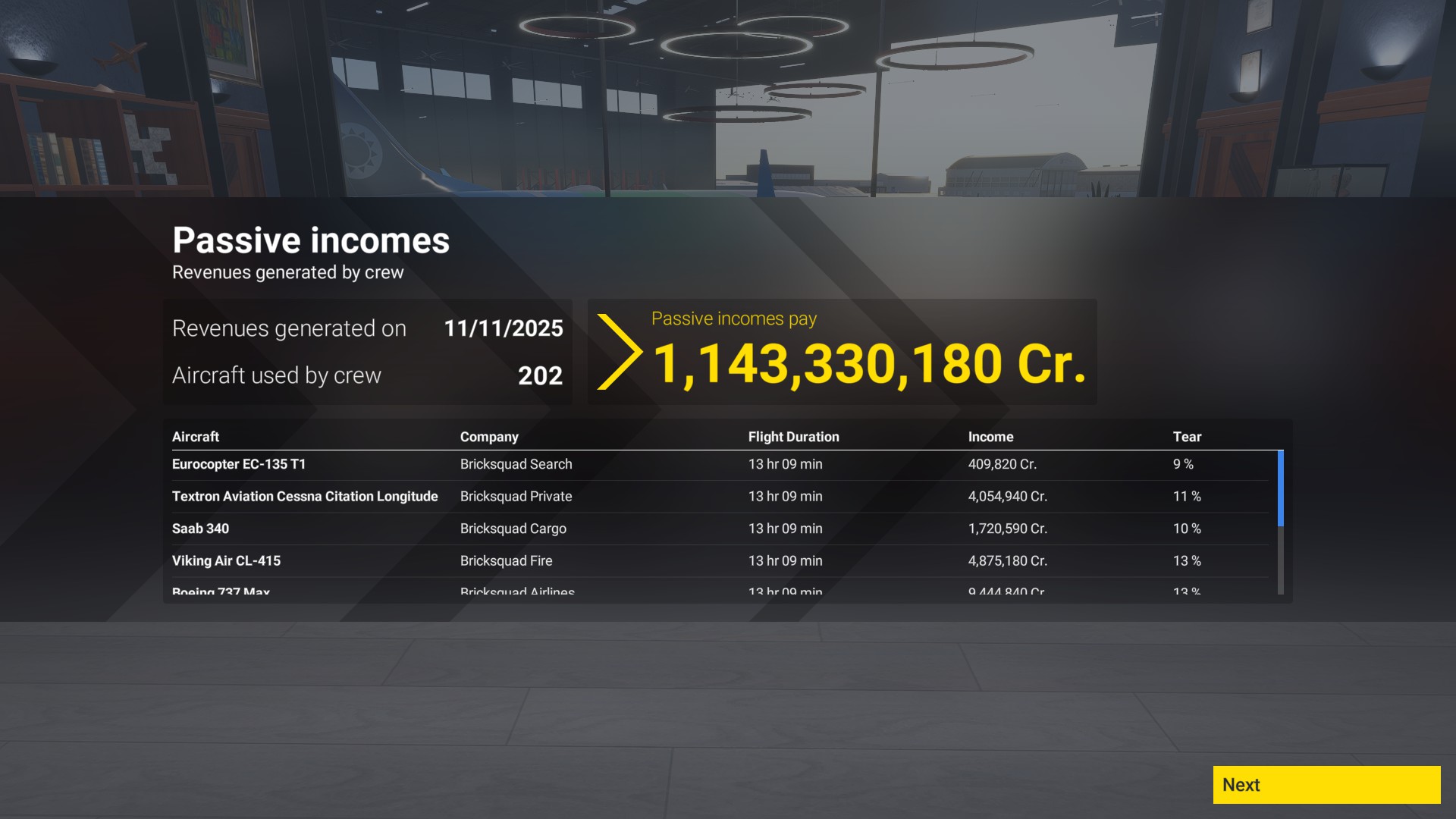 These aircraft are able to earn what they cost to buy the most quickly and are a good choice for the early stages of career mode. Bear in mind that there is no formal feature for streamlined maintenance yet so it would be unrealistic to stack up 100’s of these aircraft even though they are the most efficient since aircraft stop producing passive income after wear becomes too much.