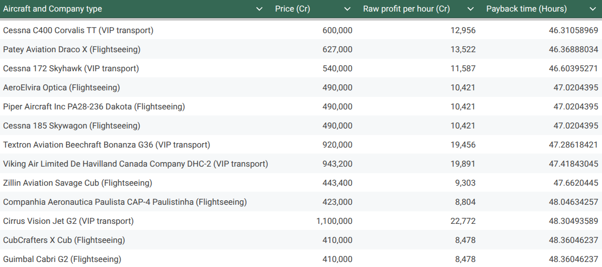- Zillin Aviation Savage Cub (looks cheap and earns decently but is less efficient than more expensive aircraft)