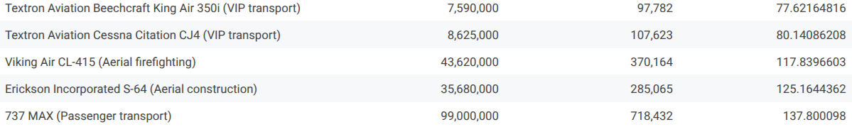 - Cessna 208B Grand Caravan (looks like a plane that is a balance of both worlds - income per hour and efficiency - but underperforms compared to other expensive aircraft)