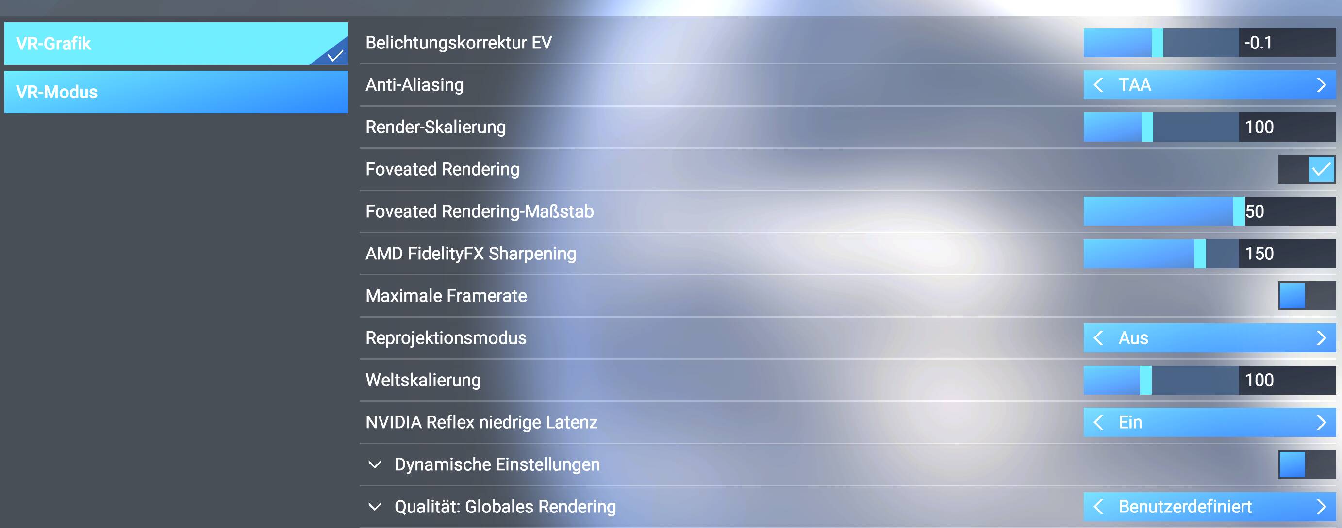 Since the buttons light up perfectly in 2D, I assume that the problem lies somewhere with the render scaling or, at most, with the foveated rendering scale. Therefore, I have attached my current VR configuration. The problem occurs in both TAA and DLSS AA modes.