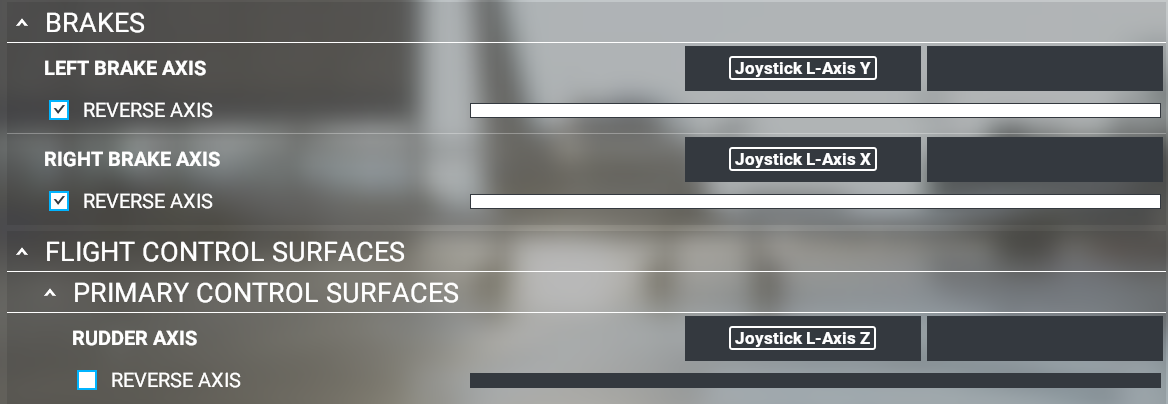 The system defaults to “Left Brake ::Joystick R- Axis Y” and “Right Brake::Joystick R- Axis X” and the “Primary Control Surface -Rudder Axis is mapped to 'Joystick Slider Y”