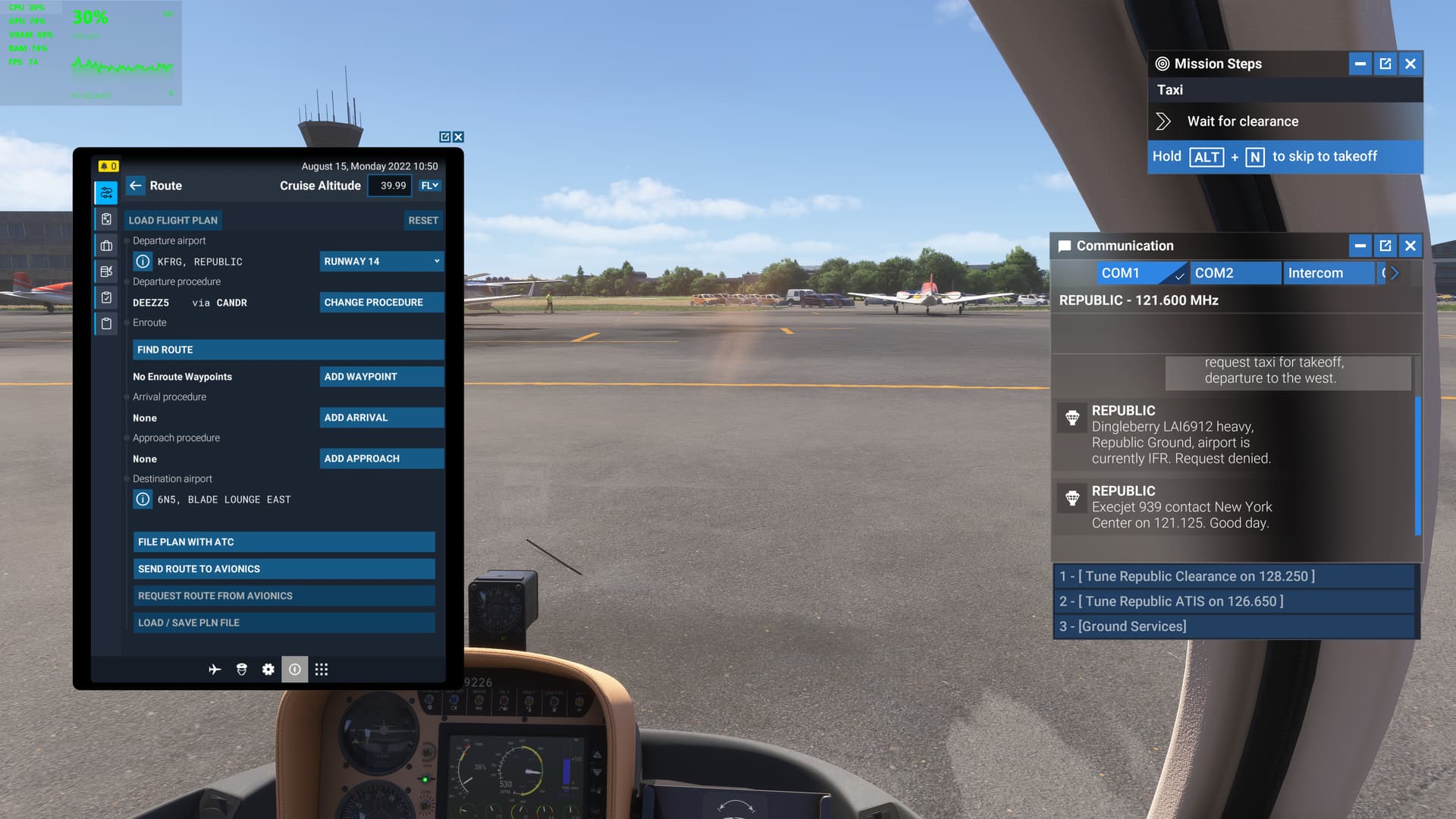 ATC said “Airport is IFR, takeoff is not authorized” when requesting to taxi at airport, but the airport is obviously VFR and looked like the normal career “few clouds” VFR preset I have seen throughout many missions. This was a flightseeing mission out of KTVL. I had to request IFR clearance to be able to taxi (and complete that part of the objective chain, and once in the air I was able to cancel IFR and then later return even though ATC did not authorize me to land. Obviously very immersion breaking, and could cause others to not be able to complete the mission.