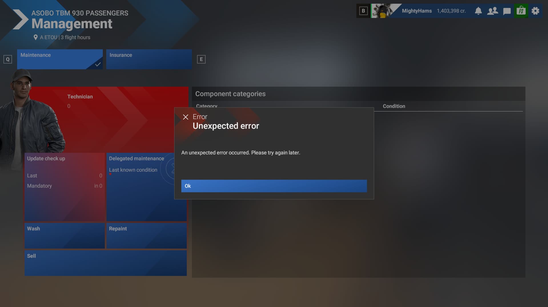 Career mode. Have a VIP Charter company and ran a Cessna. Yesterday (2/12/24) purchased an additional TBM930 as a second plane. Tried to run a mission and I could select the TBM and load the mission but when trying to start the engine ran into the issue with the plane loading with zero fuel and no way to add fuel. Ended the game for the evening. Today came back to try again (noting the suggested workaround of loading the TBM in freeflight and then it might work in career mode for that session). Loaded into freeflight then exited into career mode. I can no longer select the TBM for VIP Charter missions and even though the TBM is in my hanger it canât now be insured (see screenshot). Seems like the TBM has been removed from usable planes for this type of mission.