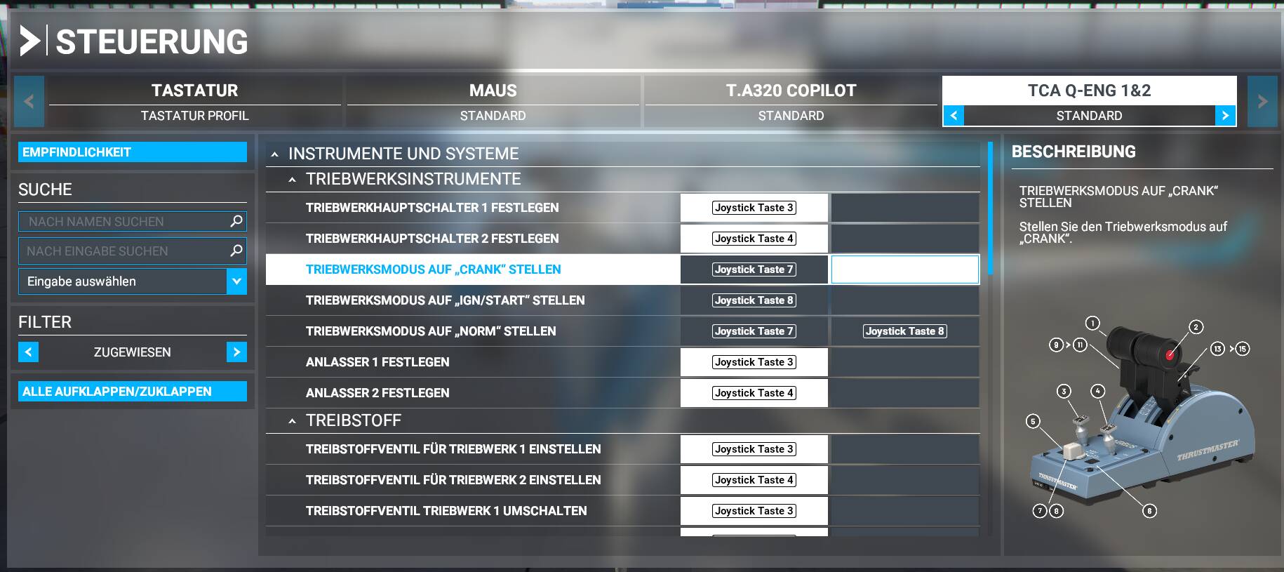 At the quadrant, the left main switch for engine one (4 mappings) is also handled as “joystick button 3”.