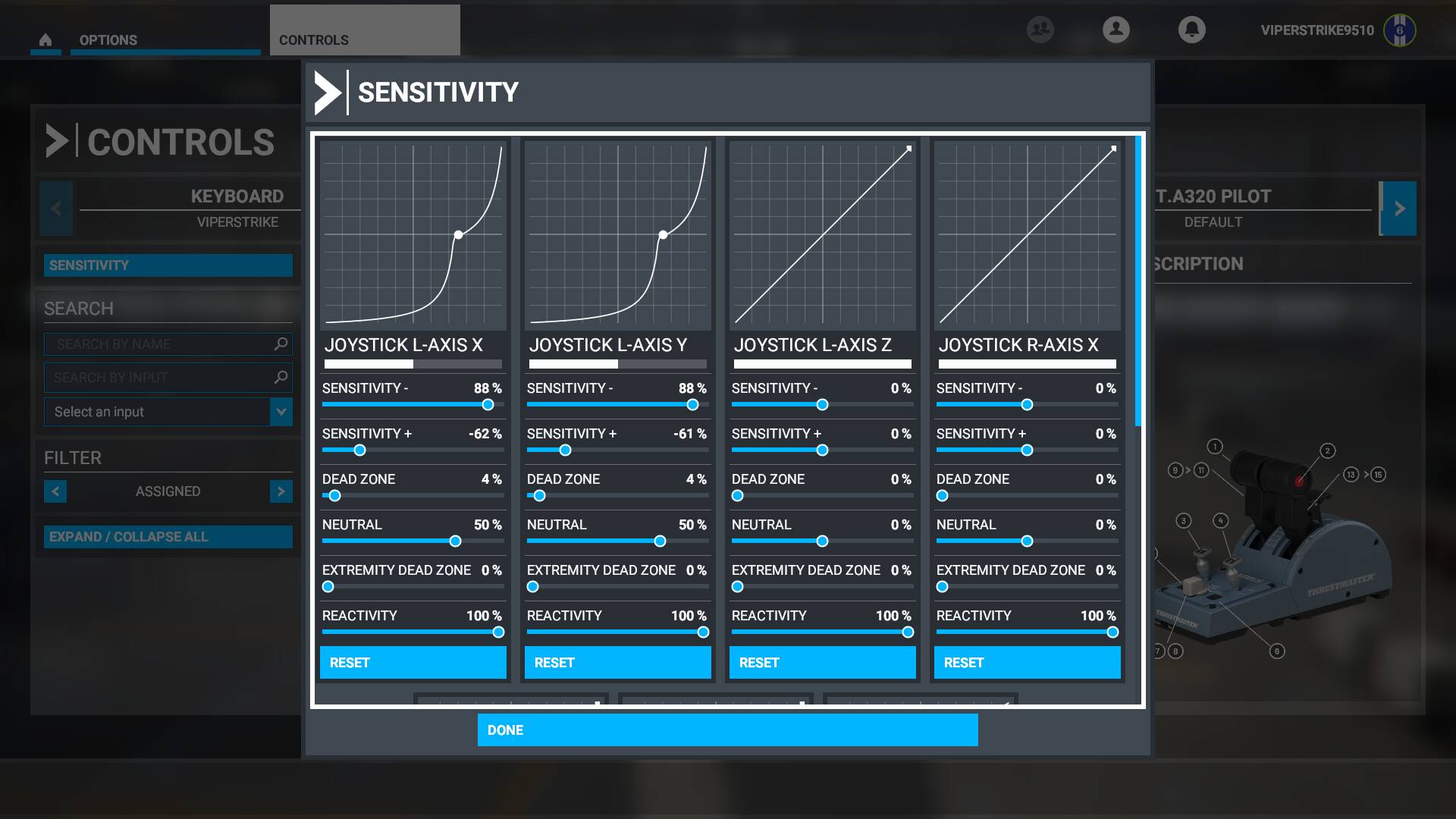 - Create a new control profile for the A320 based off from the default template. And set the sensitivity to all 0. This should make a completely linear straight line.