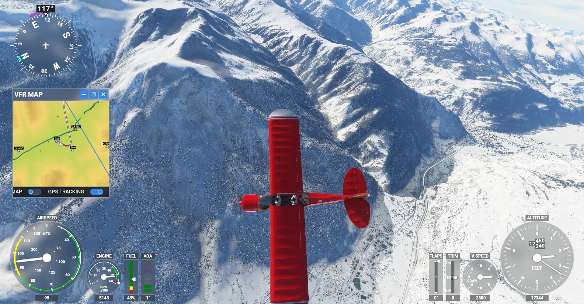 In order to fully enjoy the scenery we will be using an Cub Crafter X Cub and cruising between 90 - 100 knots, but you are free to choose any aircraft capable of cruising at the same speed. A tight turning radius may become incredibly advantageous, too