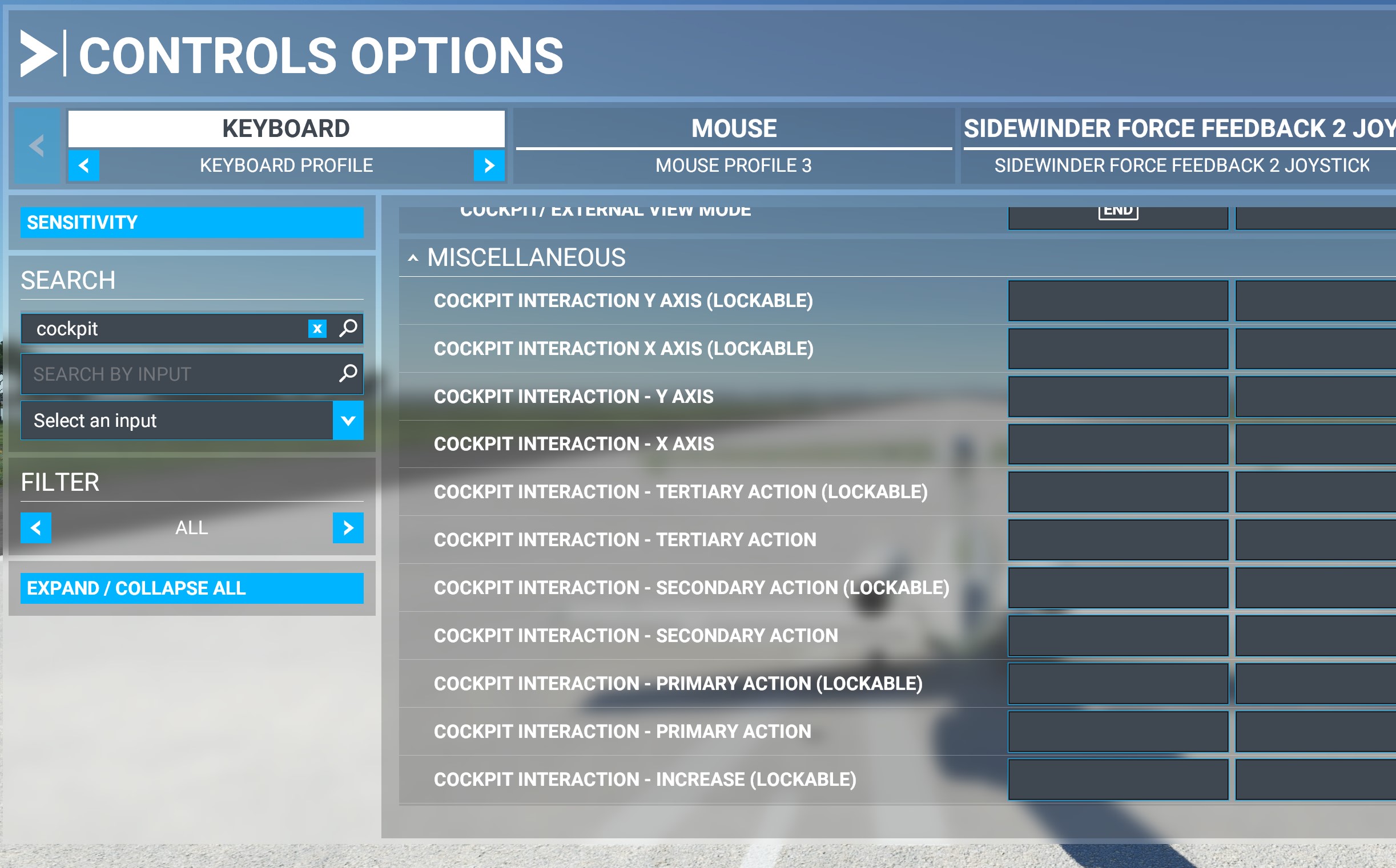 Searching the keyboard Controls Options for “Cockpit” displays these:
