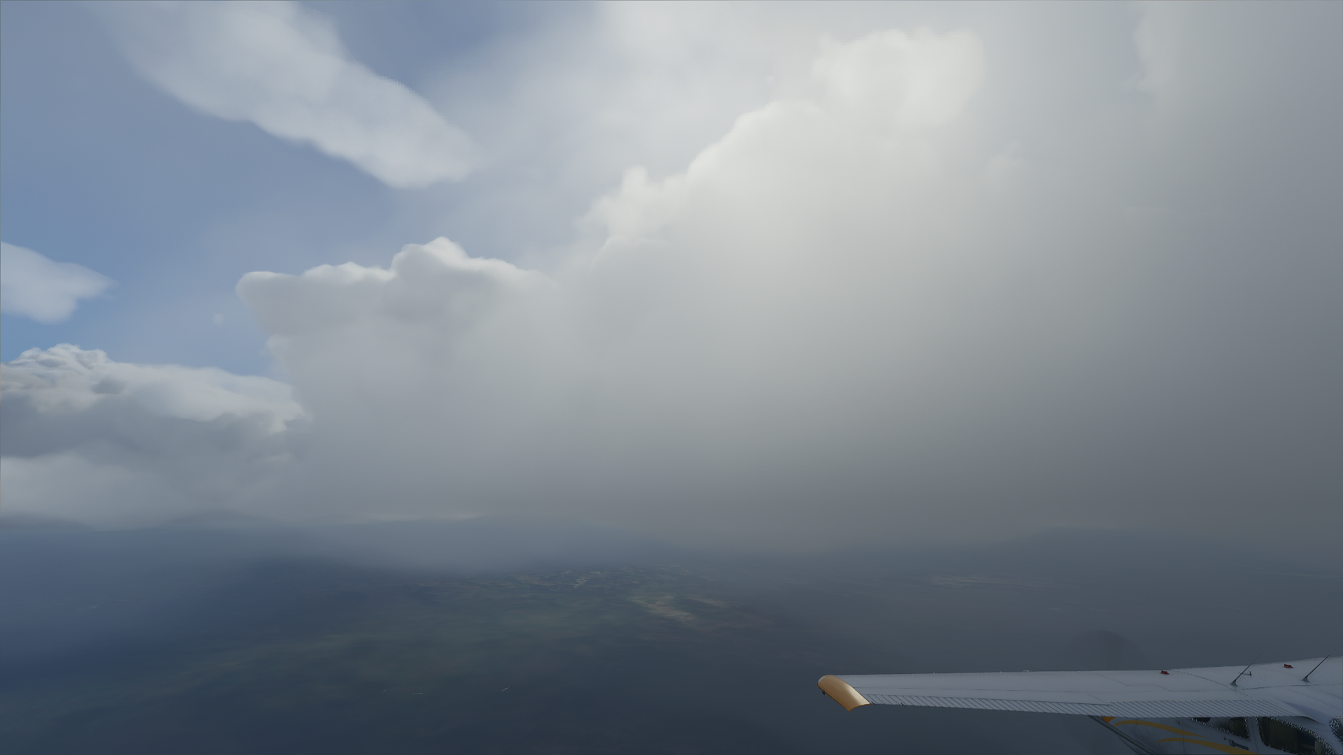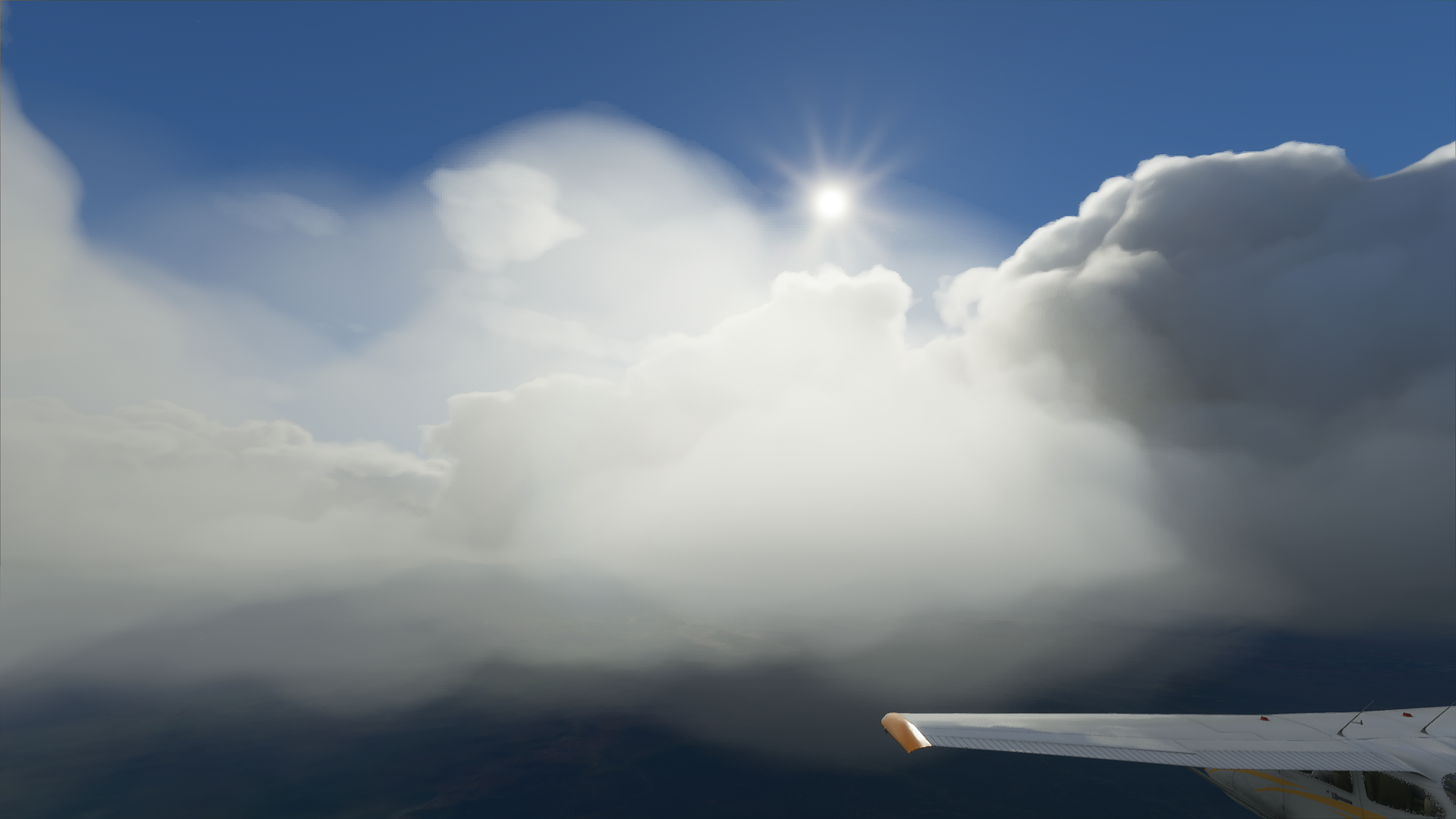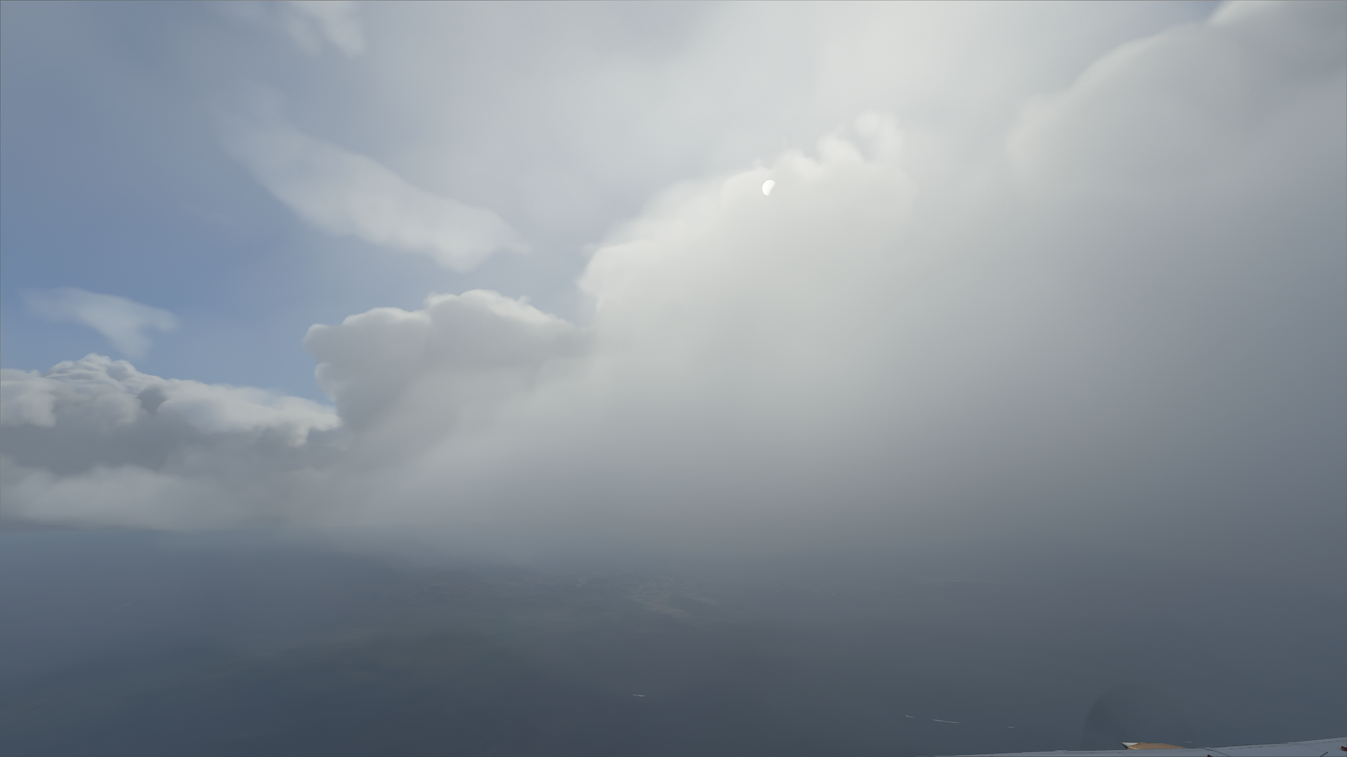 As you can see, the solar disk shines through an awful lot, and the brightening “hotspot” around it is visible pretty much all the time, which is ridiculous through almost 20k ft thick cloud layers, while in reality it’s impossible to visually locate the sun under thick overcast conditions. Same thing inside clouds.