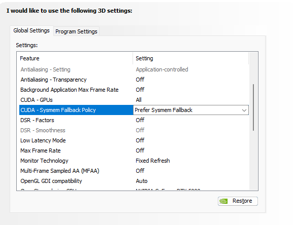 MSFS is not sandboxed (and nor should it be) so keep CUDA sysmem fallback policy enabled to “help” avoid vram and virtual memory issues. This is not an instant cure for overdone settings but it should at least “help” keep normal framedrops and stutters from becoming a slideshow (or worse).