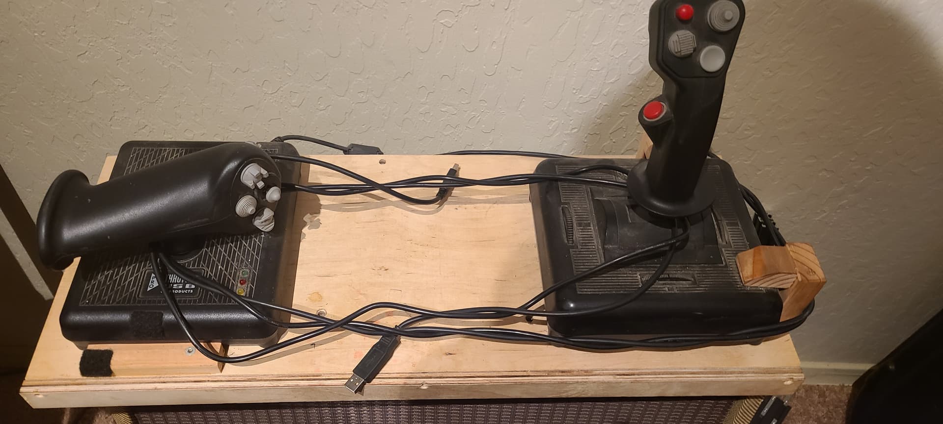 The wood tray is more recent, it was built to fit my keyboard drawer so that my stick and throttle don’t move around on the desk (really irritating in VR)