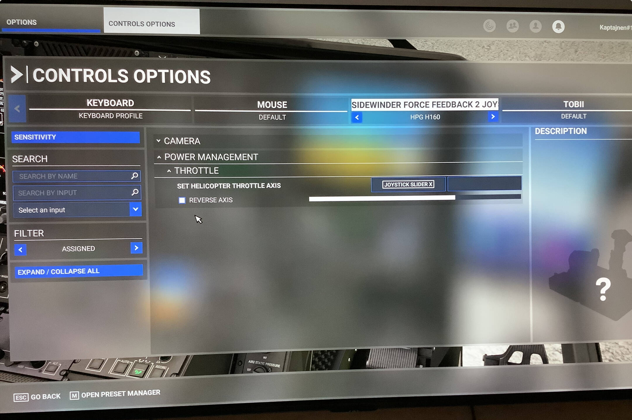 I have bound the “Helicopter Throttle Axis” to the Joystick Slider X on my FF2 joystick, but It still does not work. Also in the cockpit view, my joystick is frozen.