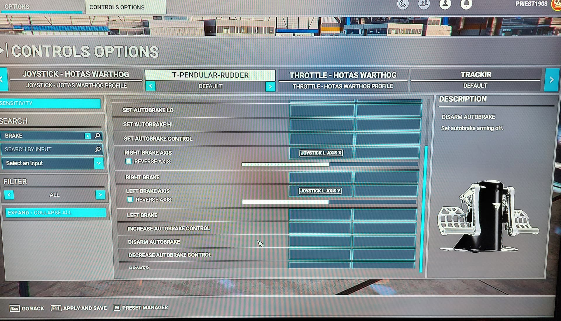 Perhaps I was not clear the first time I explained. When you first plug in thrustmaster TPR Rudder pedals the braking axis of both right and left brake pedal axis exhibit the same issue, that is the white bar running left to right showing the amount of travel of the brake axis is not present or all the way to the left at first. Then if you touch the brakes in any way they suddenly spring to half way depressed hence the brakes are now locked up. The only way to alleviate this symptoms is to tweak the sensitivities to reflect what looks like a forward slash progress line in the top left quarter of the sensitivities /tuning grid but as a result you only have half of your braking axis to negate the other half causing your brakes to lock up.