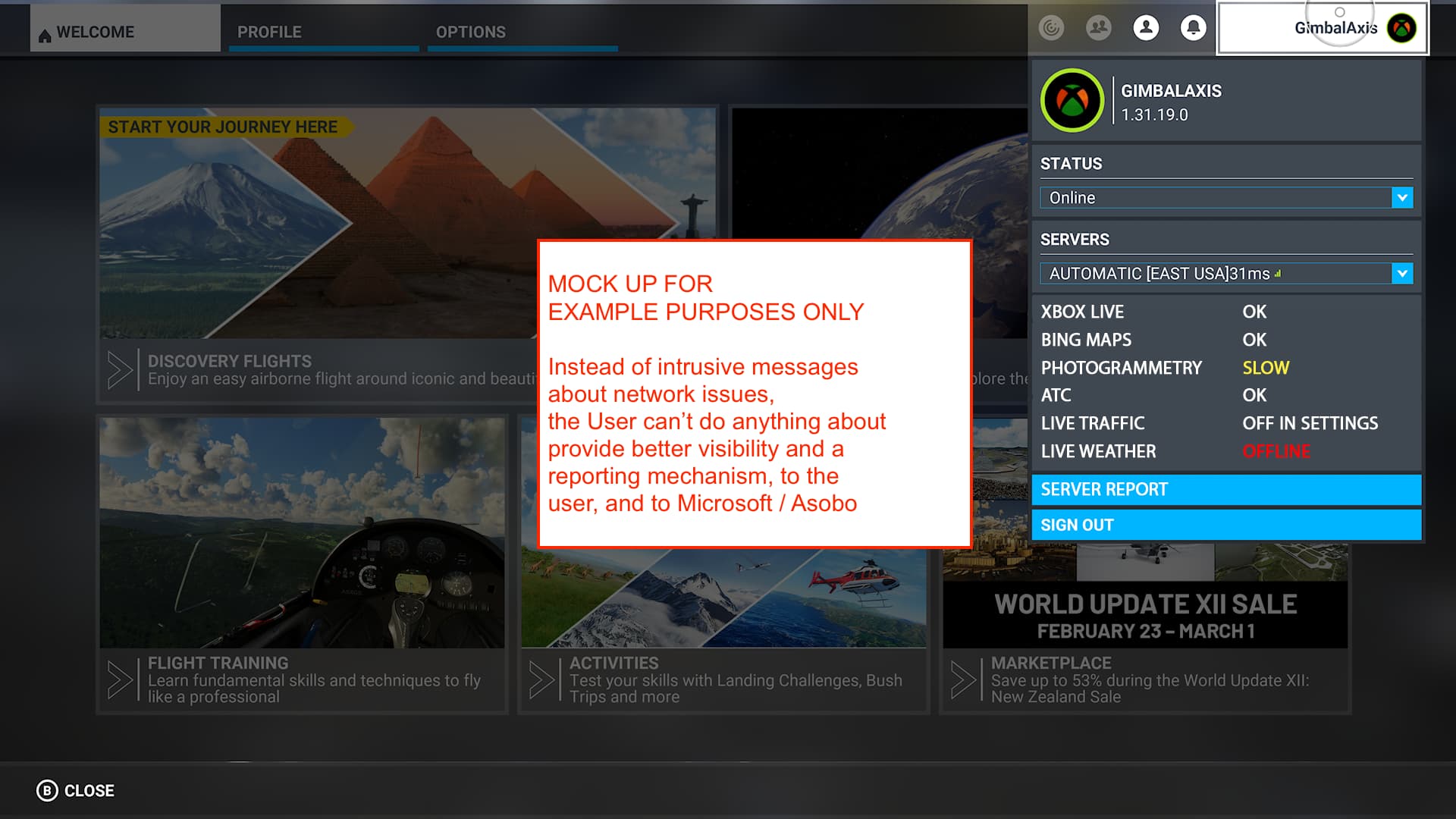 - Perhaps as part of the GamerTag in the upper right corner, where it currently lists the Multiplayer servers, they can list the other various services (Auth, Bing maps, Weather, ATC, Traffic, Photogrammetry) and the status of the individual connections IF the user wants to check - but otherwise… DON’T BREAK IMMERSION.