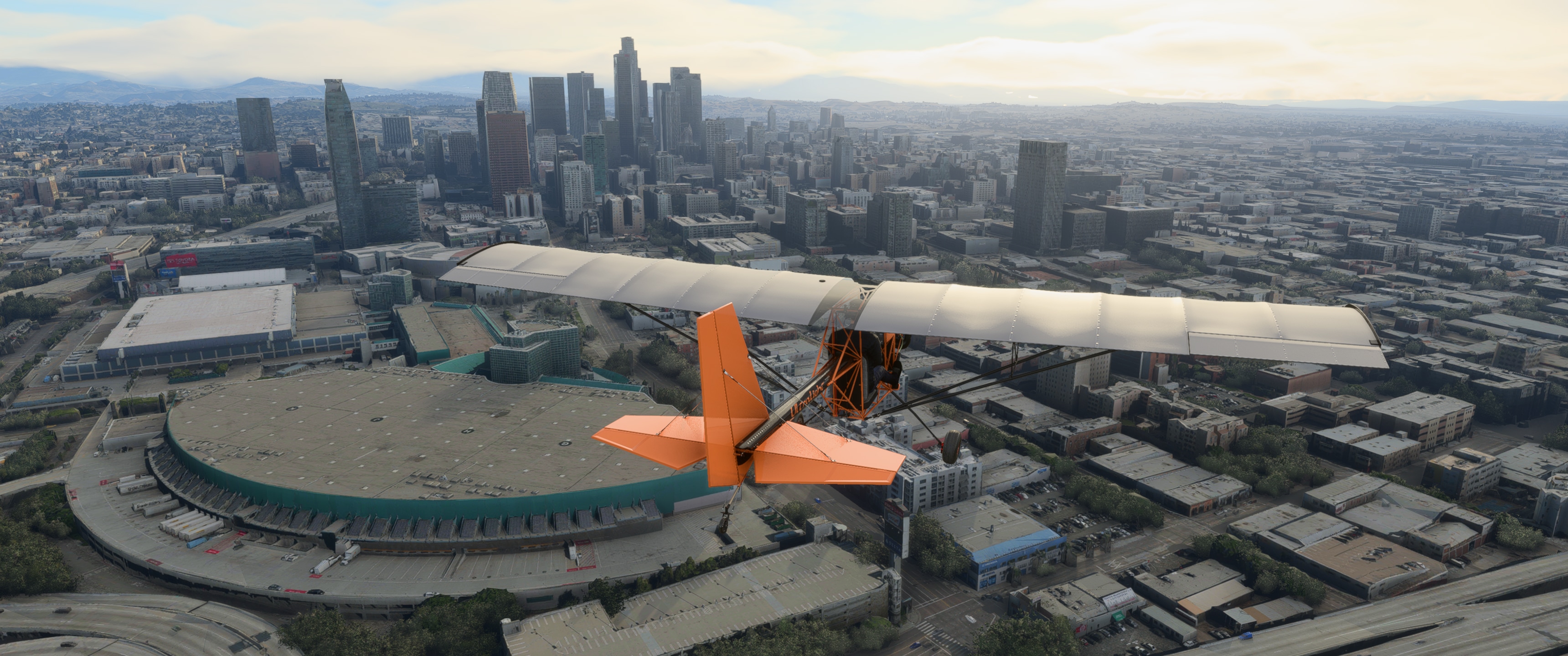 Top Rudder Solo 103: an accessible ultralight that’s built a little on the rugged side. Great for “low-n-slow” sightseeing trips – but IRL you can’t fly over downtown Los Angeles. Two things to note: first, the prop is clutched out when the engine is at idle – your engine isn’t dead! Just throttle back up and it picks up. Second: there’s no trim (just like in real life) so plan to cruise at whatever engine power keeps you level. At default weight & balance, at or below 1500 feet it will cruise level at about 7500 rpm. Note that at higher altitudes you lose thrust, so this is not ideal for flight in the mountains as you may go high enough that full throttle doesn’t keep you level without maintaining pressure on the stick.