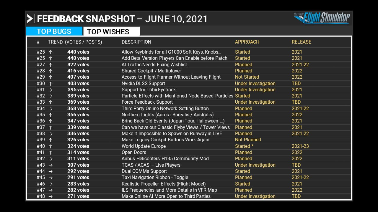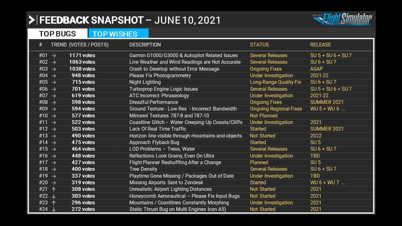 [update2] for those wondering why Asobo is taking so much time with bug fixes, you have to realize they are receiving a lot of Zendesk and this takes time just triaging. In looking at my last 2 reports (68719 Oct 16 14:32 and 70848 Oct 25 14:15) you can deduce they have received 2129 request during this time. If they were treating all of them over the 5 working days in this time span, there are about 426 request per day to read, analyse, answer or dispatch!! If they’re working 8h a day, this is nearly 1 request per minute… This should put some of these numbers in perspective.