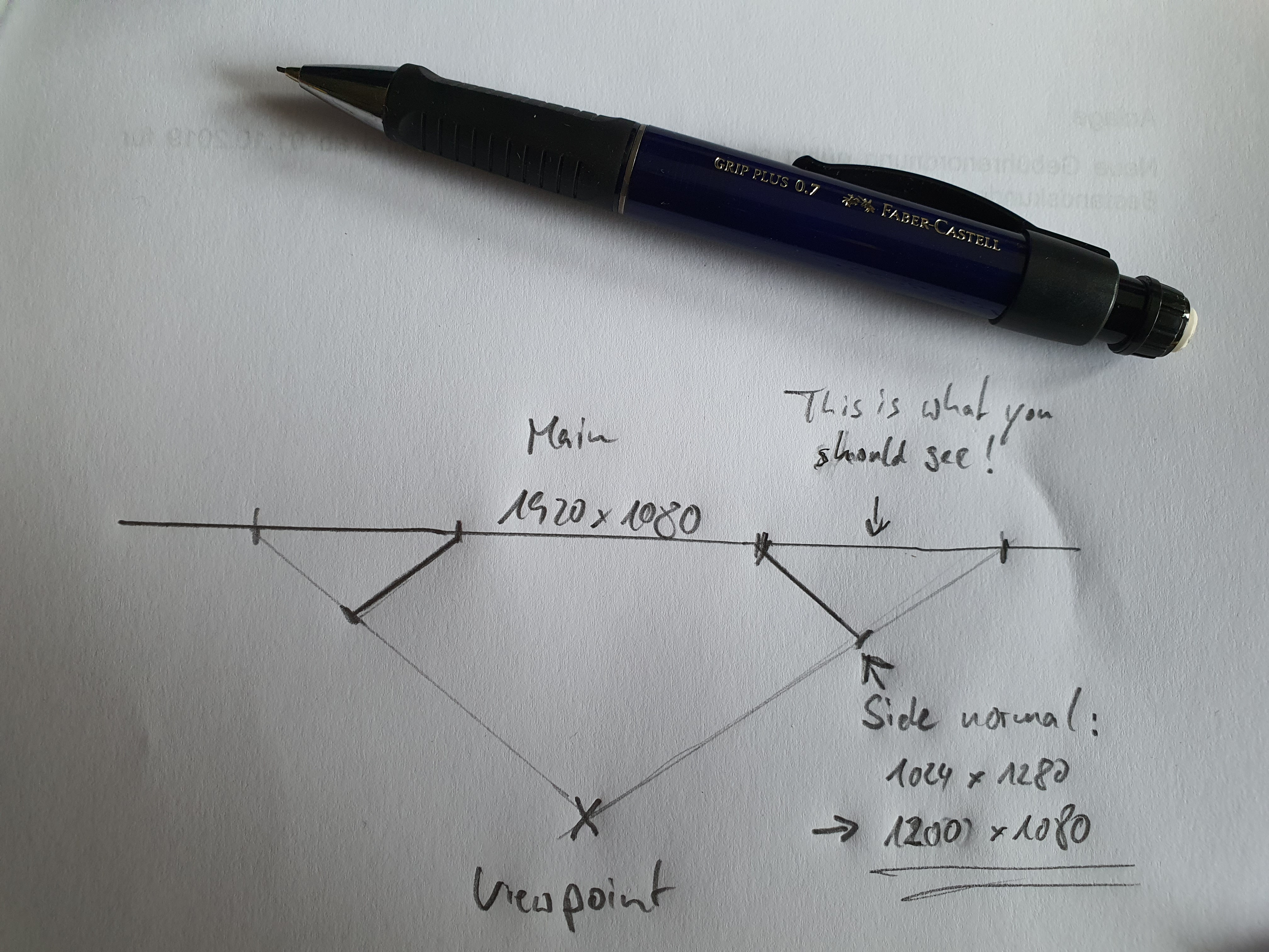When you have the side monitors in an angle to the main monitor it is like looking through a window to a monitor that is in the same angle as the main monitor. This “virtual monitor” (“This is what you should see”) behind your monitor is wider, than the side monitor is: